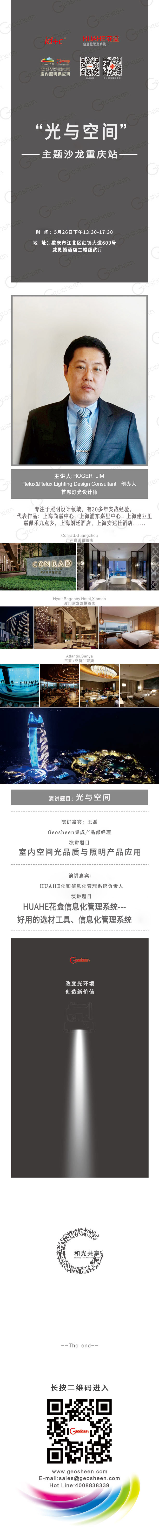 2018年5月26日下午Geosheen極成 在重慶市江北區(qū)紅棉大道609號(hào)威靈頓酒店二樓紐約廳,聯(lián)合HUAHE花盒信息化管理系統(tǒng)、《id+c室內(nèi)設(shè)計(jì)與裝修》雜志主辦《光與空間》主題設(shè)計(jì)師沙龍活動(dòng)。