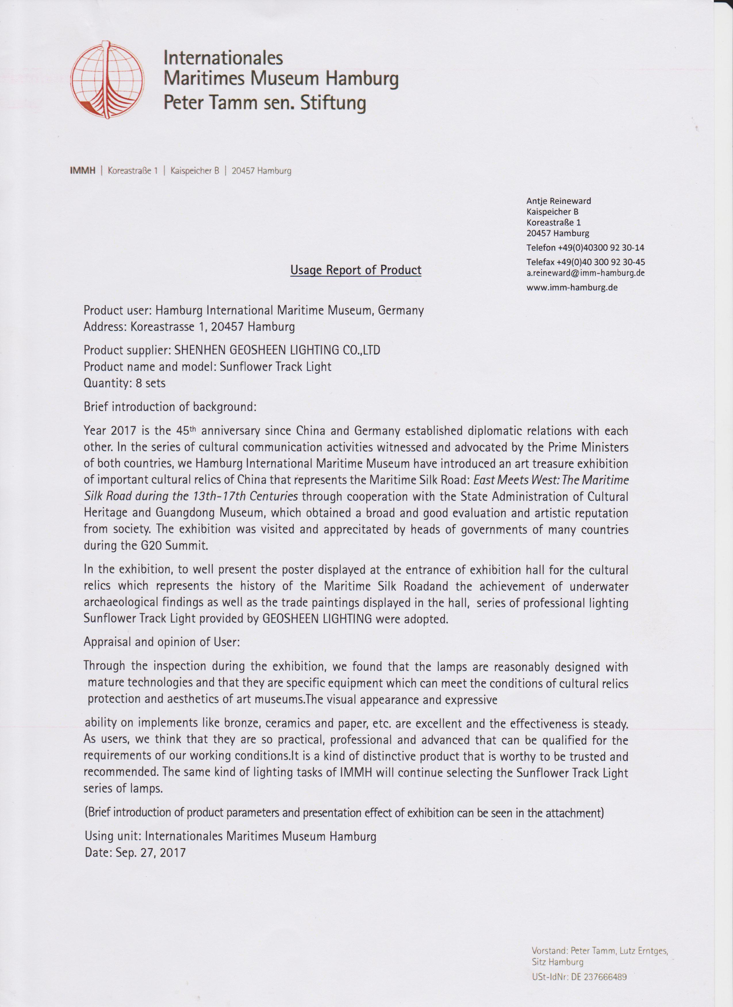 德國漢堡國際海事博物館作為產品使用方對專業(yè)博物館照明品牌Geosheen極成的產品燈具使用報告,報告內容是對 Geosheen極成M系列太陽花軌道燈的燈光效果和光品質的肯定,同時也對Geosheen極成技術專業(yè)性給予認可。