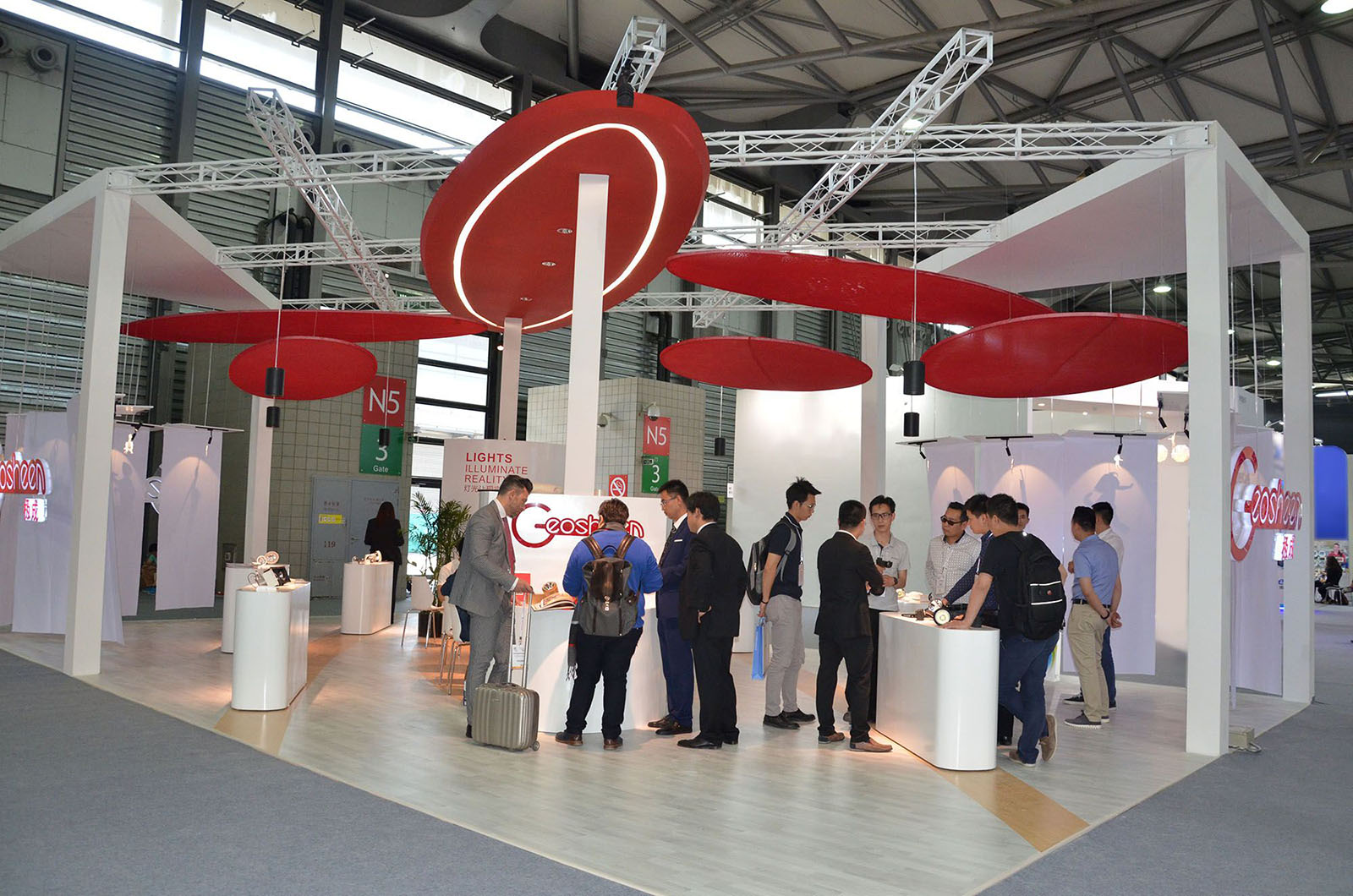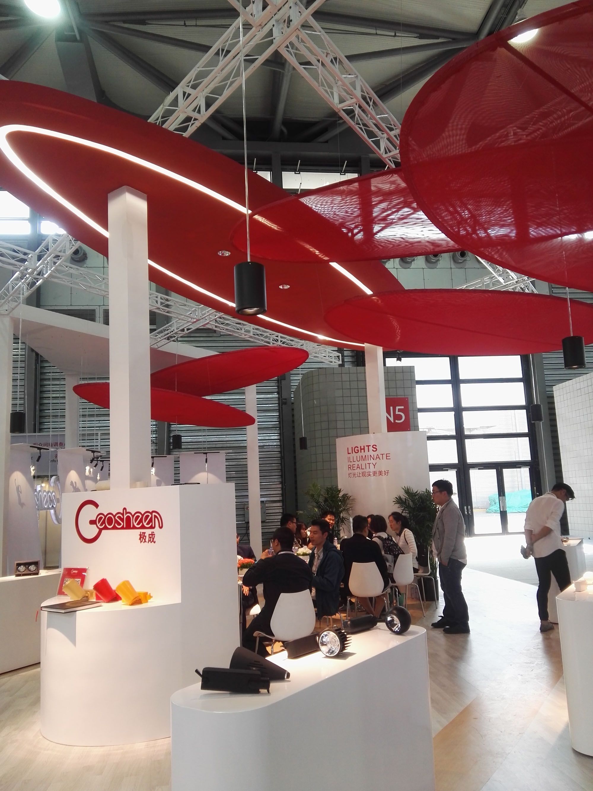 據(jù)悉,這次Geosheen極成整個(gè)展場(chǎng)設(shè)計(jì)圍繞“燈光讓現(xiàn)實(shí)更美好”為主題,用燈光打出舞動(dòng)的影子,開放的空間,流暢的動(dòng)線,都是為了展現(xiàn)輕盈舞動(dòng)的感覺。
