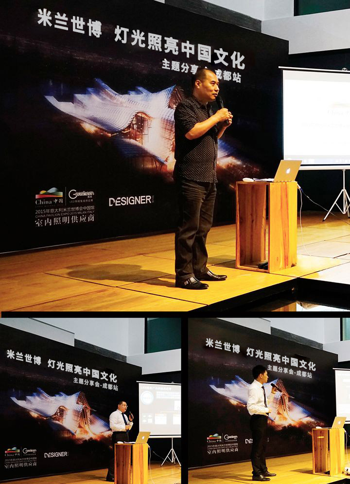 7月14日下午,鐵像寺水街的輕安舉行“米蘭世博?Geosheen極成 燈光照亮中國(guó)文化”主題分享會(huì)成都站,來(lái)自成都120位設(shè)計(jì)師參與。會(huì)上極成光電國(guó)內(nèi)營(yíng)銷事業(yè)部總經(jīng)理朱明先生與大家講解了LED照明趨勢(shì)及發(fā)展;米蘭世博會(huì)中國(guó)館藝術(shù)總監(jiān),清華大學(xué)美術(shù)學(xué)院教授張?jiān)伦鳛樘匮钨e對(duì)米蘭世博會(huì)中國(guó)館的東方文化藝術(shù)進(jìn)行了深層解讀,給現(xiàn)場(chǎng)觀眾深刻的印象;隨后,極成光電的照明設(shè)計(jì)師黃智誠(chéng)先生針對(duì)米蘭世博會(huì)中國(guó)館的室內(nèi)LED照明技術(shù)進(jìn)行解析。通過(guò)三個(gè)嘉賓不同主題演講,成都設(shè)計(jì)師沒(méi)對(duì)專業(yè)LED照明有了新的認(rèn)識(shí),對(duì)世博會(huì)中國(guó)館的燈光也有了全面了解。