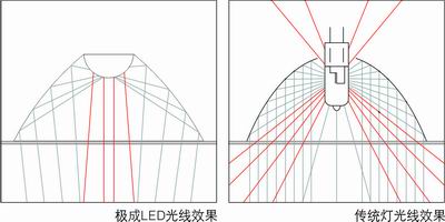 極成LED照明(左) 傳統(tǒng)金鹵燈(右)