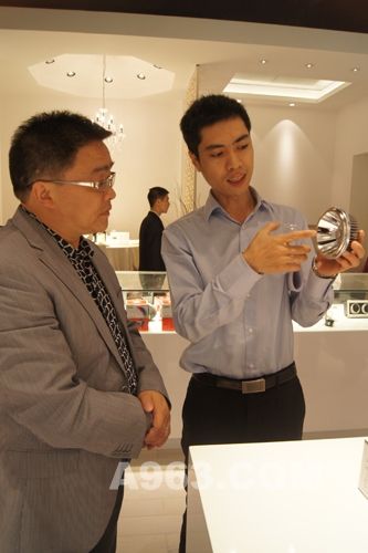 極成光電董事長(zhǎng)林陳鋒向中華室內(nèi)設(shè)計(jì)網(wǎng)總裁趙慶祥介紹一款擁有國(guó)際專(zhuān)利技術(shù)的AR111射燈