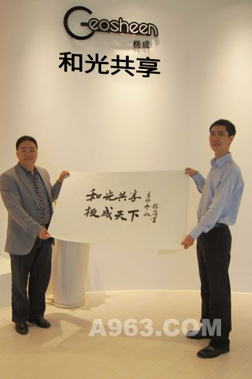隨后,林董事長(zhǎng)邀請(qǐng)趙慶祥總裁前往光體驗(yàn)中心的貴賓休息廳品茶,在這個(gè)書(shū)香四溢的休息廳內(nèi),透過(guò)書(shū)法字畫(huà)、各類(lèi)獲獎(jiǎng)證書(shū)、精致的紅木家私以及典雅的 室內(nèi)設(shè)計(jì),充分的體現(xiàn)出極成的企業(yè)領(lǐng)導(dǎo)對(duì)于中國(guó)文化的重視和品位。雙方暢談甚歡之時(shí),林陳鋒董事長(zhǎng)誠(chéng)邀趙慶祥總裁留下了墨寶。最后林陳鋒董事長(zhǎng)表示,極成 光電將與中華室內(nèi)設(shè)計(jì)網(wǎng)達(dá)成長(zhǎng)久的合作,并歡迎更多的設(shè)計(jì)師們能前往極成Geosheen全景式LED照明光體驗(yàn)中心進(jìn)行參觀和交流。