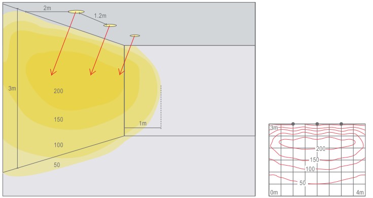 天花燈洗墻照明是將燈具嵌入天花板將光線投射到墻上,光斑由中間向外擴(kuò)散,中間較亮,周圍光斑均勻過渡。