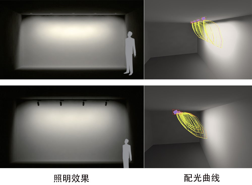 兩種洗墻照明方式都能達(dá)到墻面亮度均勻分布的效果??梢愿鶕?jù)不同的需求選擇適合的方式。