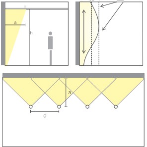 天花燈洗墻照明的燈具到墻面的距離(a)一般是墻面高度(h)的1/3,燈具間距離(d)1.2米,可以實(shí)現(xiàn)理想的洗墻效果。