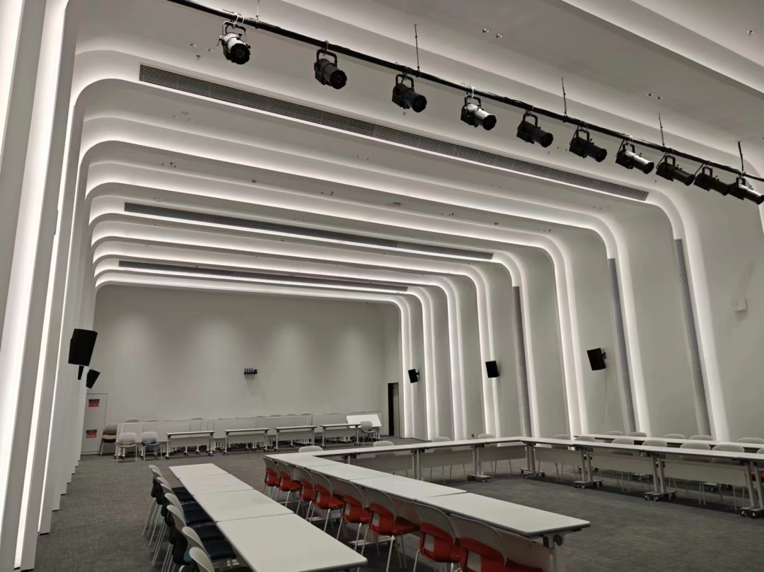 多功能室的魅力在于它隨著使用場(chǎng)景的切換而展現(xiàn)不同的風(fēng)貌,如同一位善于變臉的藝術(shù)家。為了滿足這多變的需求,其設(shè)計(jì)風(fēng)格需兼具靈動(dòng)與實(shí)用。專業(yè)的燈光設(shè)計(jì)則成為實(shí)現(xiàn)這一目標(biāo)的得力助手?;⌒蔚木€條裝飾巧妙地隱藏著軟燈帶,當(dāng)燈光亮起時(shí)如同流星劃過夜空,為空間注入了科技感和未來氛圍。而裝飾凹槽間鑲嵌的防眩天花燈,則像是點(diǎn)點(diǎn)繁星,為各個(gè)場(chǎng)景提供了恰到好處的照明。這兩者的完美結(jié)合,使得整個(gè)空間如同一個(gè)夢(mèng)幻的魔法世界,充滿了無限可能與驚喜。