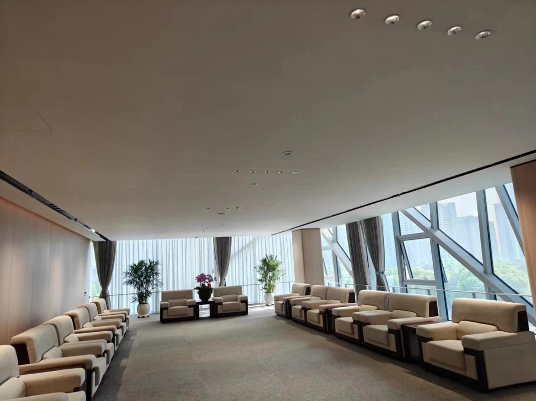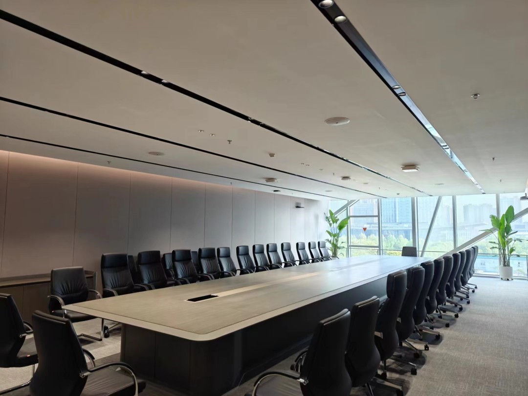 會(huì)議室專為集思廣益、共商大計(jì)而設(shè)的空間,以其簡(jiǎn)潔明亮之姿,詮釋著高效與現(xiàn)代的融合。天花頂黑色的凹槽設(shè)計(jì)如星河般引導(dǎo)著視覺的延伸,似乎要將人們的思緒引向那深邃無垠的宇宙。而平頂天花上,Geosheen極成防眩天花燈巧妙地隱匿其中,既滿足了會(huì)議的照明需求,又巧妙地避免了眩光的干擾。暗藏的軟燈帶,則如同細(xì)水長(zhǎng)流,發(fā)出柔和而溫暖的光芒,為整個(gè)空間增添了幾分寧靜與雅致。在這樣的環(huán)境下,每一個(gè)角落都彌漫著和諧與舒適的氣息,仿佛時(shí)間在這一刻凝固,只為讓人們更好地沉浸在思維的海洋中,激蕩出智慧的火花。