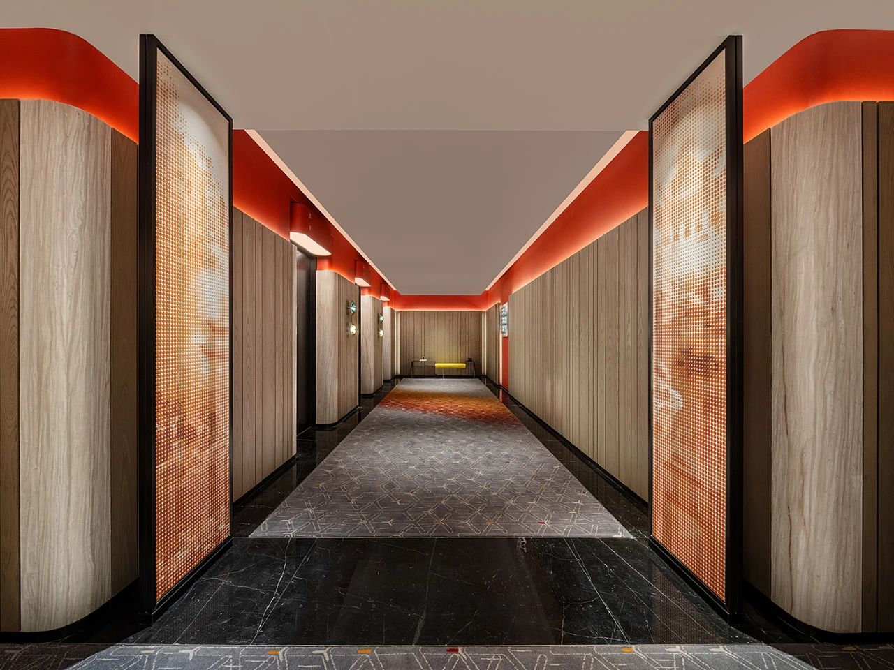 電梯廳與客房走道,以楓葉的色調(diào)與形狀來進(jìn)行點(diǎn)綴。而客房則注重現(xiàn)代酒店的舒心體驗,以輕快簡約的線條,勾勒出時尚靈感的氛圍。