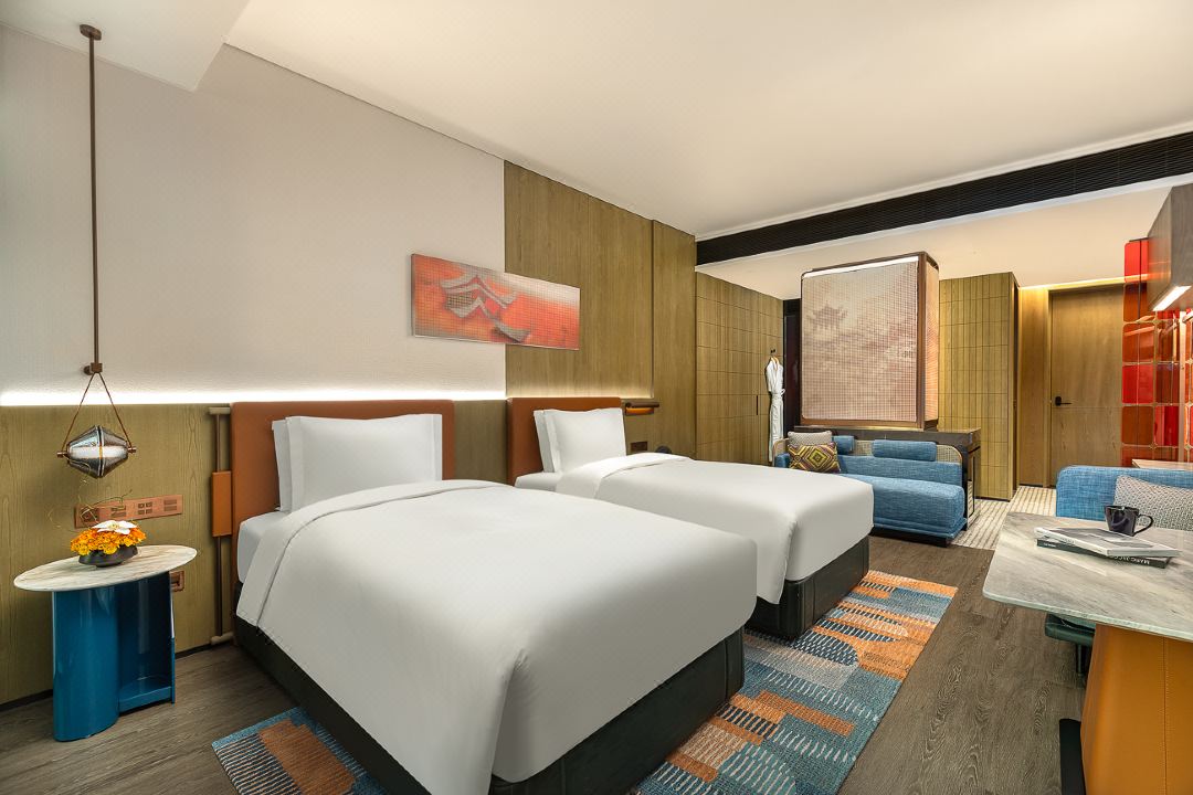酒店空中大堂宛如岳麓書院縮影,重現(xiàn)激昂論道風(fēng)云,歡迎來自五洲四海的旅者?;瘯隳頌橄娼庇浚S著朱張的腳步,攜滿載山、水、洲、城的創(chuàng)意房卡,探索這濃墨的文化底蘊(yùn)以及重彩的絢麗設(shè)計,開啟引人入勝的"求學(xué)問道"之旅,品味長沙的時代風(fēng)潮。
