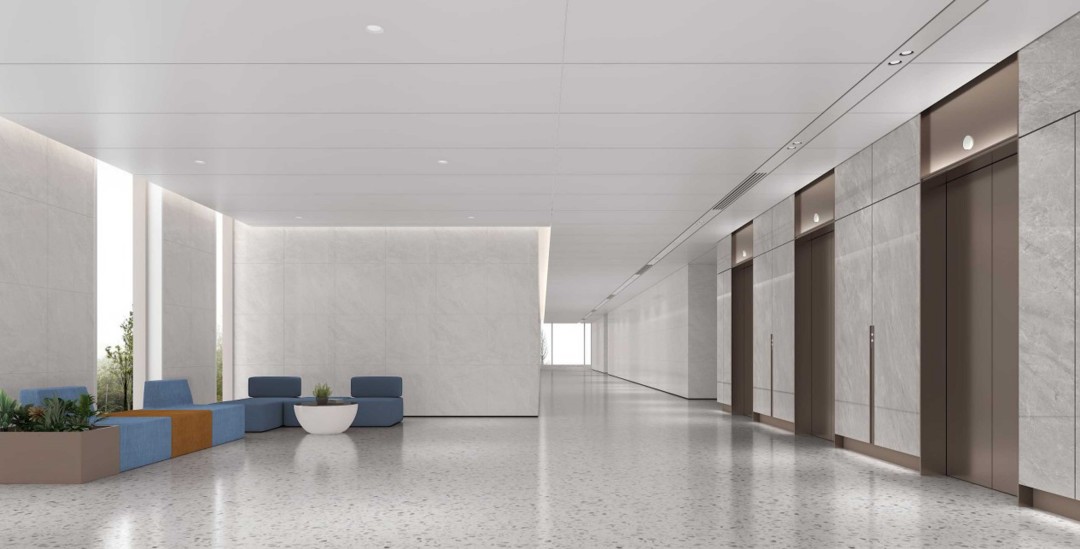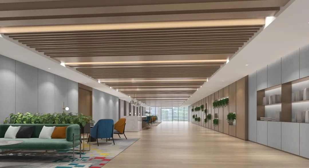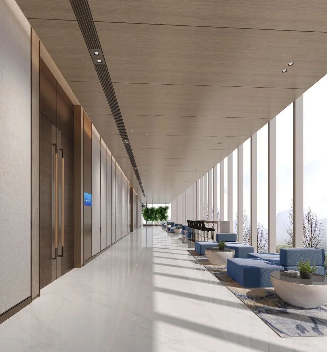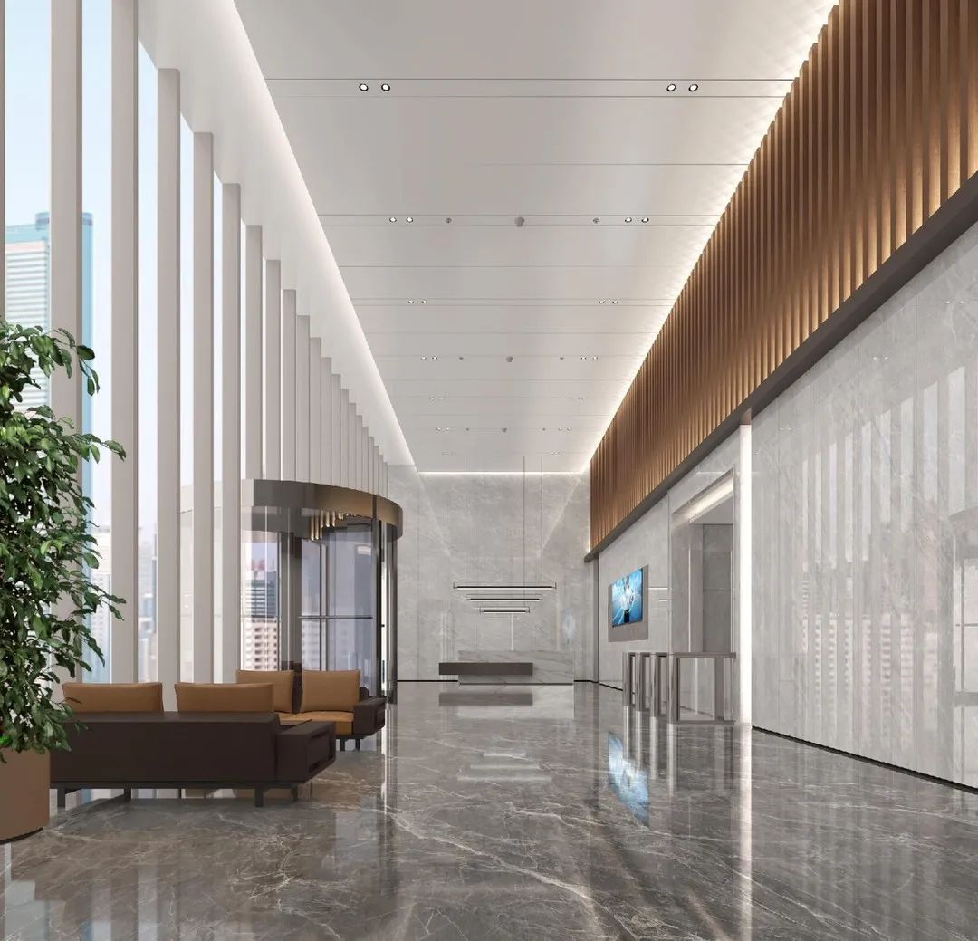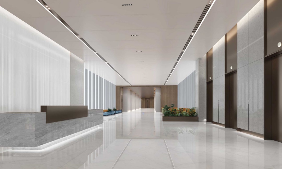 大堂的設計以簡約莊重、突出整個大堂的空間感為主基調,要與建筑物外面的環(huán)境建立真正的聯系,并非僅限于辦公室或建筑物的四墻之內,座位、花盆和迎賓墻等各種接待元素,會將公司的形象形成一個室內到室外結合。