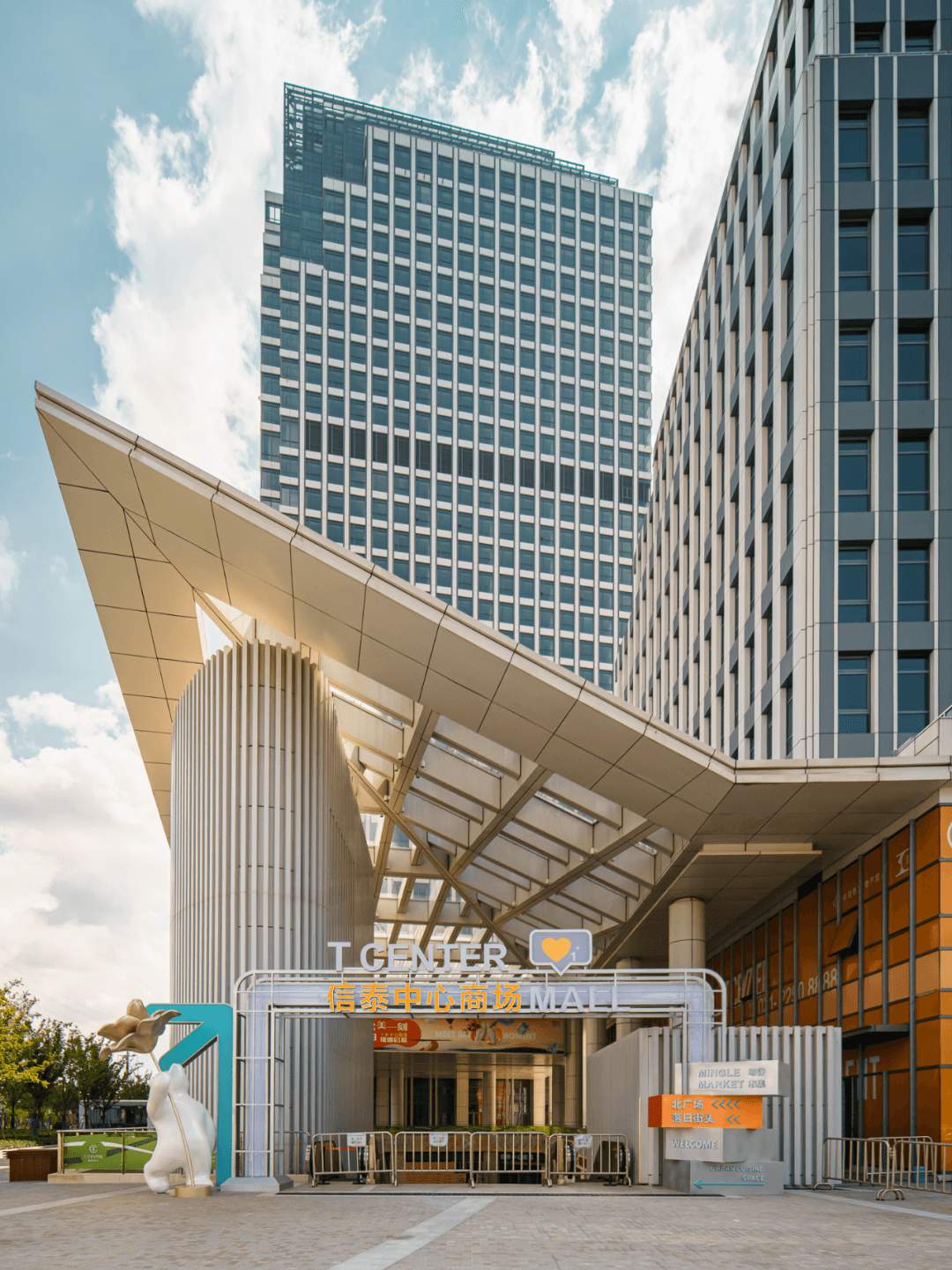 為了深化項(xiàng)目城市門戶的形象,上海信泰中心在雙塔辦公樓中間建造約 1000 平方米共享互動(dòng)的“城市客廳”,從地下2層商業(yè)直接貫穿到位于地上2層的寫字樓大堂平臺(tái),無論是搭乘軌道交通,還是驅(qū)車,來到上海信泰中心都能感受到其開放、融合的城市氛圍。
