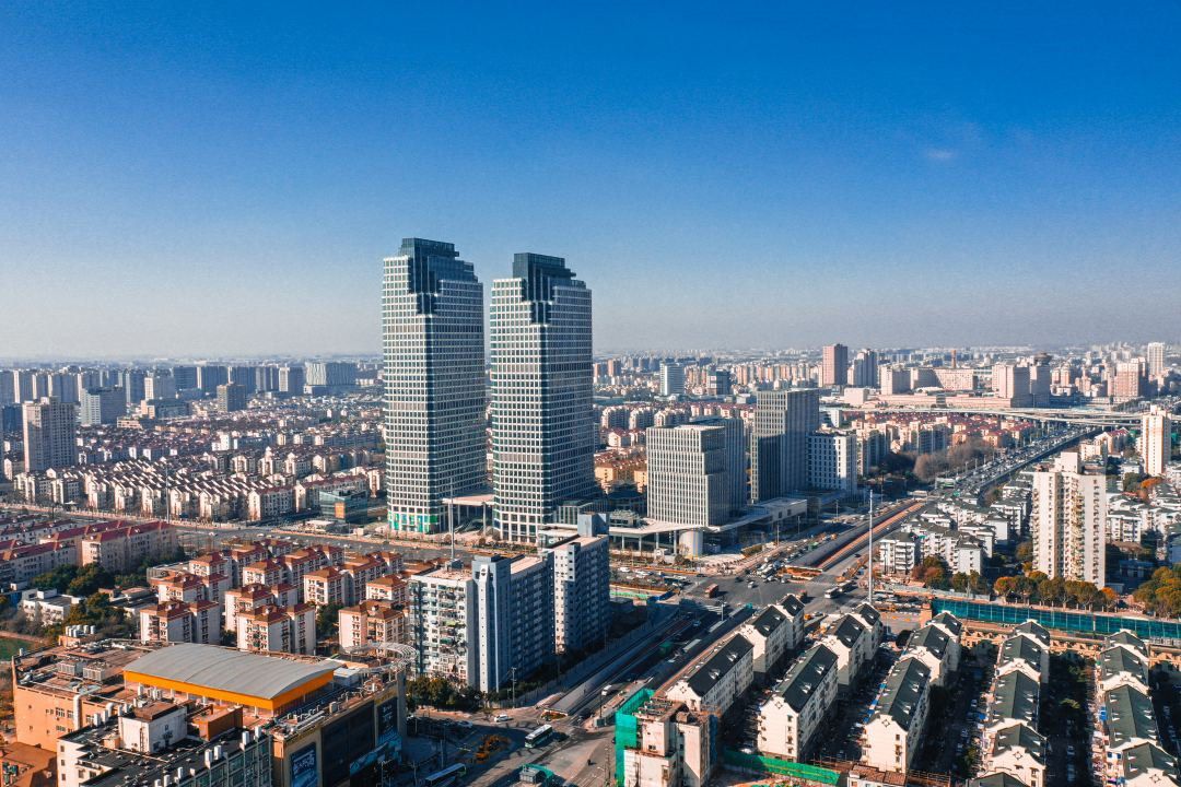 國(guó)際知名建筑事務(wù)所Gensler設(shè)計(jì)了約 180 米和 171 米的超高層甲級(jí)辦公樓雙塔,造型通過不斷向上伸展后在頂部交匯,與其頂冠共同形成燈塔造型,寓意為指明城市未來方向的燈塔,也代表了普陀商務(wù)空間的未來高度。