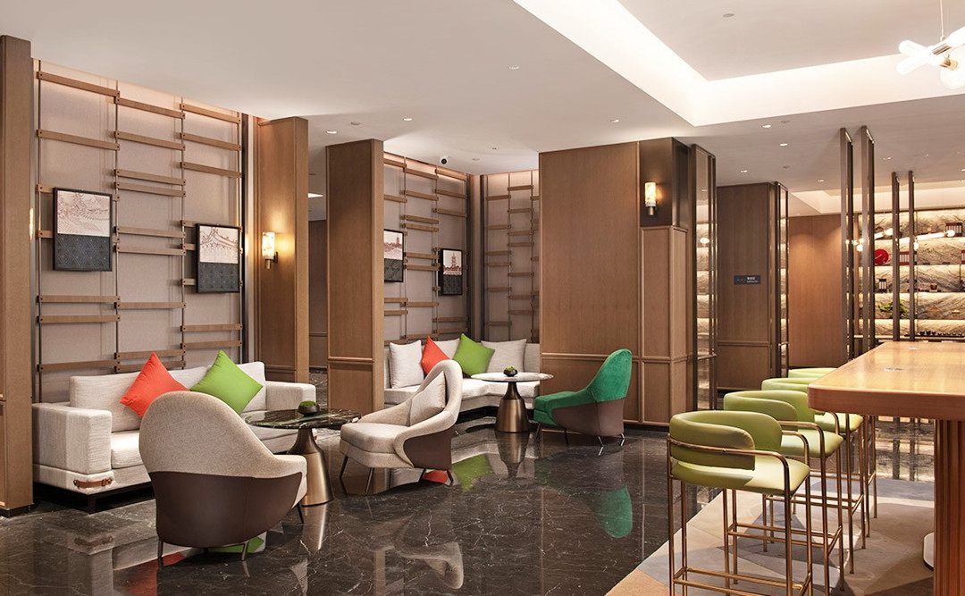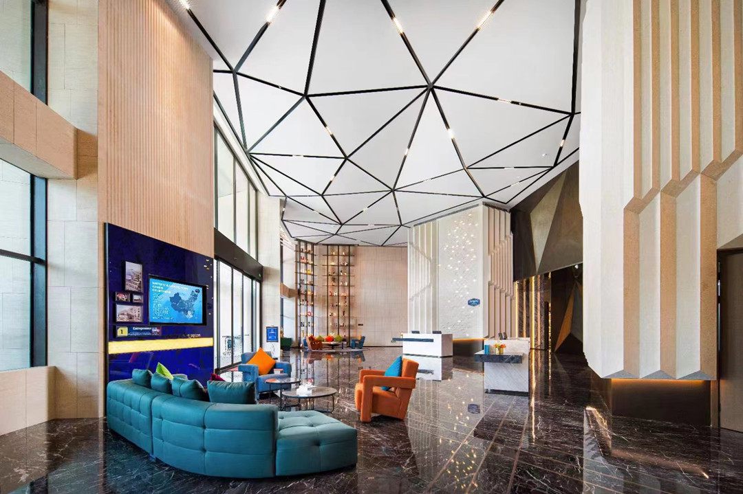大堂采用不同石種的搭配,燈光設計的目的,讓色彩和材質相得益彰,增加空間的對比和張力,頂部選用嵌入式2700K色溫的良好防眩效果的十頭格柵射燈作為功能照明,嵌入式安裝與天花頂線槽的完美融合,讓酒店更具視覺美感。
