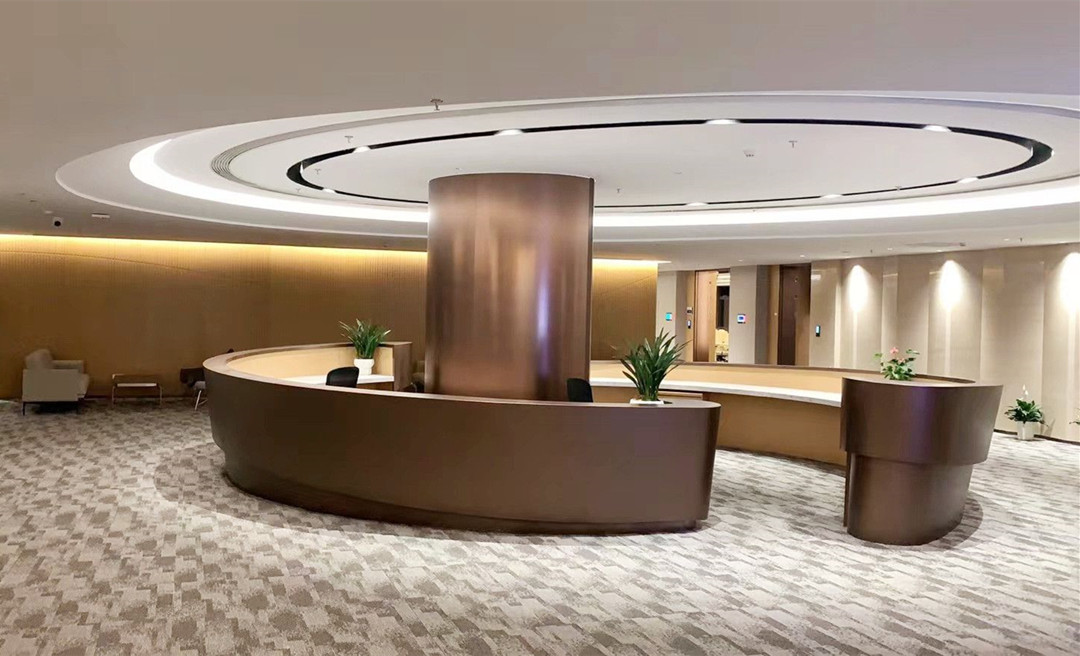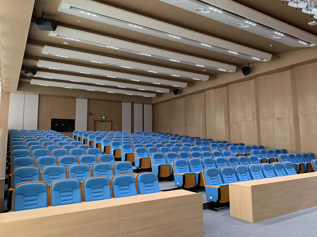 多功能廳作為社交、科研交流的主要場所,空間的風(fēng)格同整體園區(qū)保持一致。頂部條形吊頂天花,表面看起來是同階梯座位保持統(tǒng)一線條感。其他還有一個作用是為了隱藏嵌入式條形燈,滿足會場燈光需求。