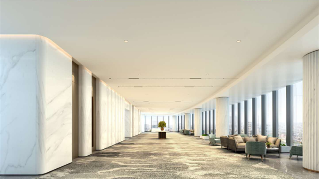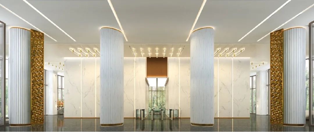 漢融中心一層大堂和公共區(qū)域全部采用高級進口大理石裝修,核心筒更采用意大利進口魚肚白裝飾,大堂的燈光設計得更亮一些,才能表現(xiàn)出商務的氣氛。采用線性燈提供細致均勻的光線為大堂空間提供大面積的照明。既能彰顯高貴氣質,顯示出其獨特的魅力和空間感受。外立面采用全落地玻璃墻幕和全不銹鋼落地窗,最大限度的利用自然照明。