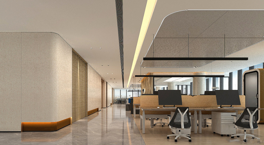 走廊過道的空間氛圍,直接影響員工的心理情緒,美觀簡潔大方是大家都追求的。走廊區(qū)域的照明,要讓人們可以在走廊中清楚地找到自己想去的地方,并且整個照明要和辦公室裝飾和諧統(tǒng)一。條形天花燈提供均勻舒適的亮度,給予來往人員的亮度指引,嵌入式天花燈重點凸顯走廊的飾品和家具。兩者的結合提升空間的視覺層次感。直線排列的條形天花燈與墻的曲線的造型,使整個走廊過道區(qū)域擁有一種流線型的動態(tài)感。