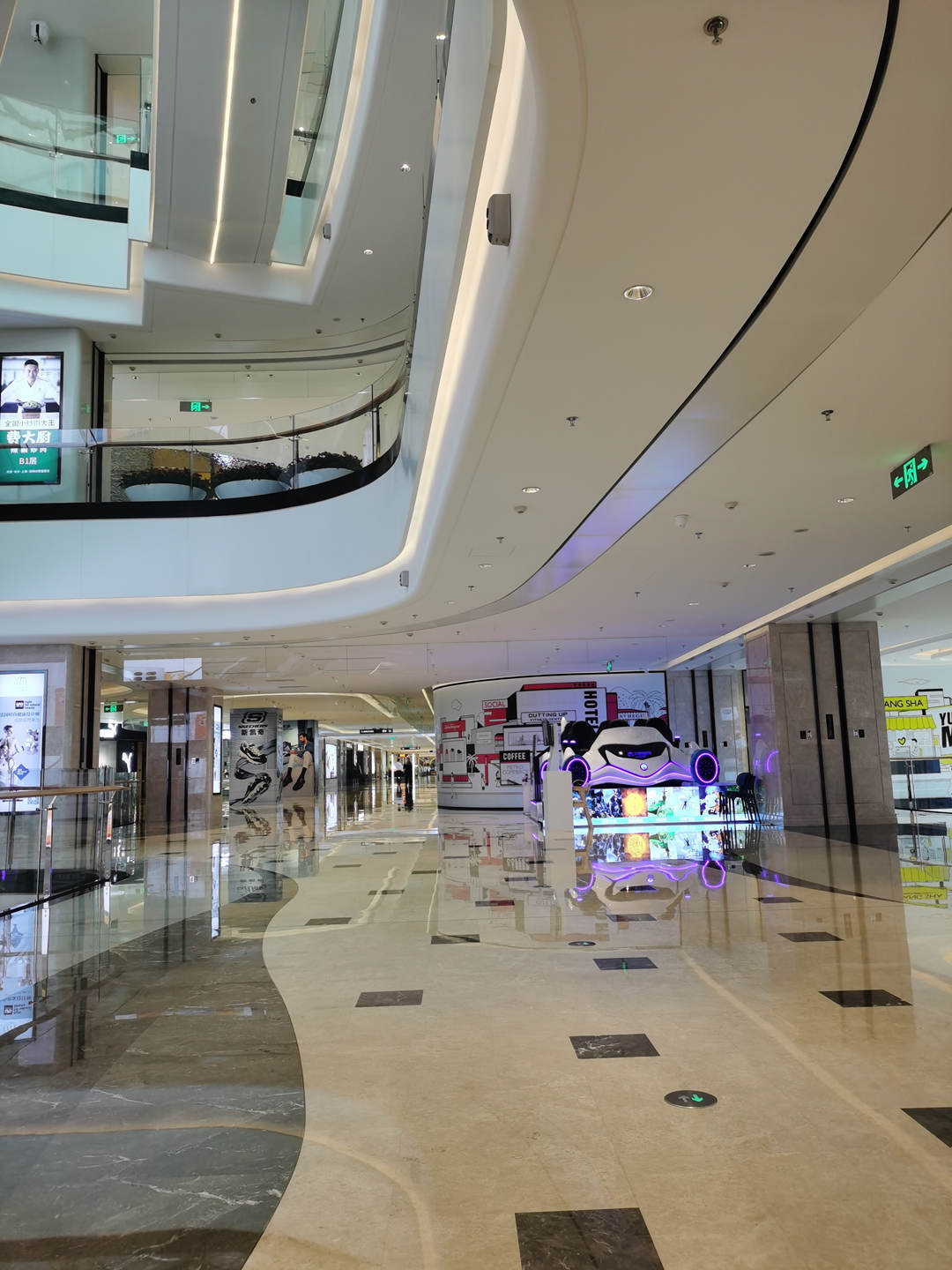 空間內(nèi)大量是用燈帶環(huán)繞四周,整個(gè)中庭的線條充滿時(shí)空感,同時(shí)進(jìn)一步突出購物中心的整體性,選用深藏防眩射燈均勻布置,能夠滿足高空間的照度需求。