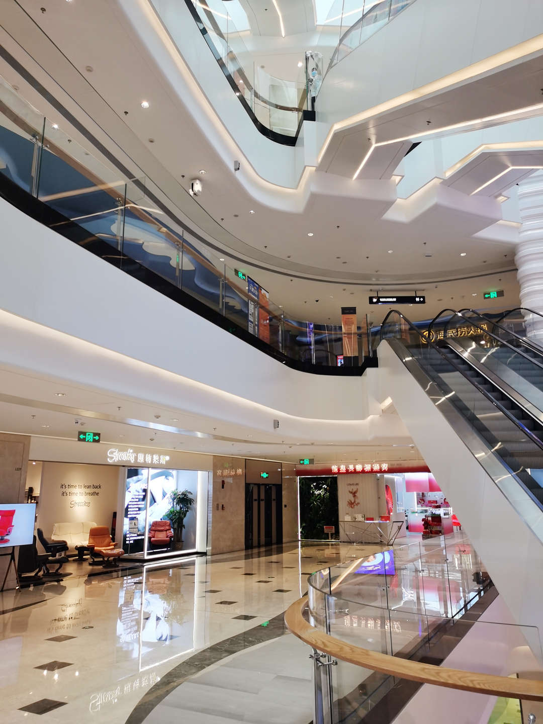 運(yùn)達(dá)匯購物中心內(nèi)部設(shè)計(jì)風(fēng)格精致又簡約,中庭區(qū)域的照明意圖主要考慮眩光的控制,商場內(nèi)利用走廊照明、欄河照明、天花照明等,間接照明方式達(dá)到良好的防眩效果,燈具按天花造型排布結(jié)合暗藏等漫射照明,營造明亮、愉快的光環(huán)境氛圍,空間通透,襯托出商場的輕奢大氣。
