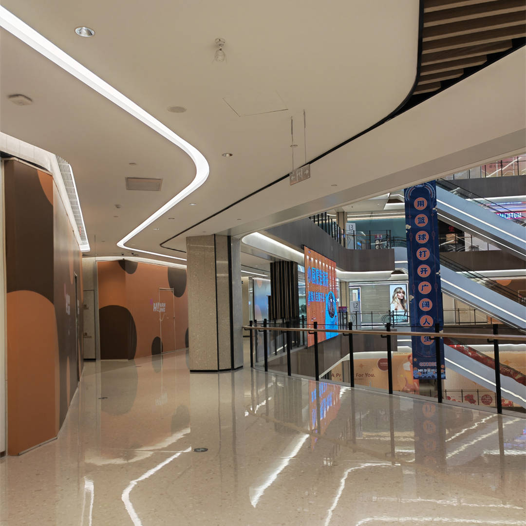 電梯是購物中心人流頻率較大的區(qū)域,整體簡潔的設(shè)計(jì)加以燈帶營造氛圍,筒燈提供主要的照明,嵌入式的燈光彌補(bǔ)了視覺中的剛硬冷峻,使人倍感親切舒適。