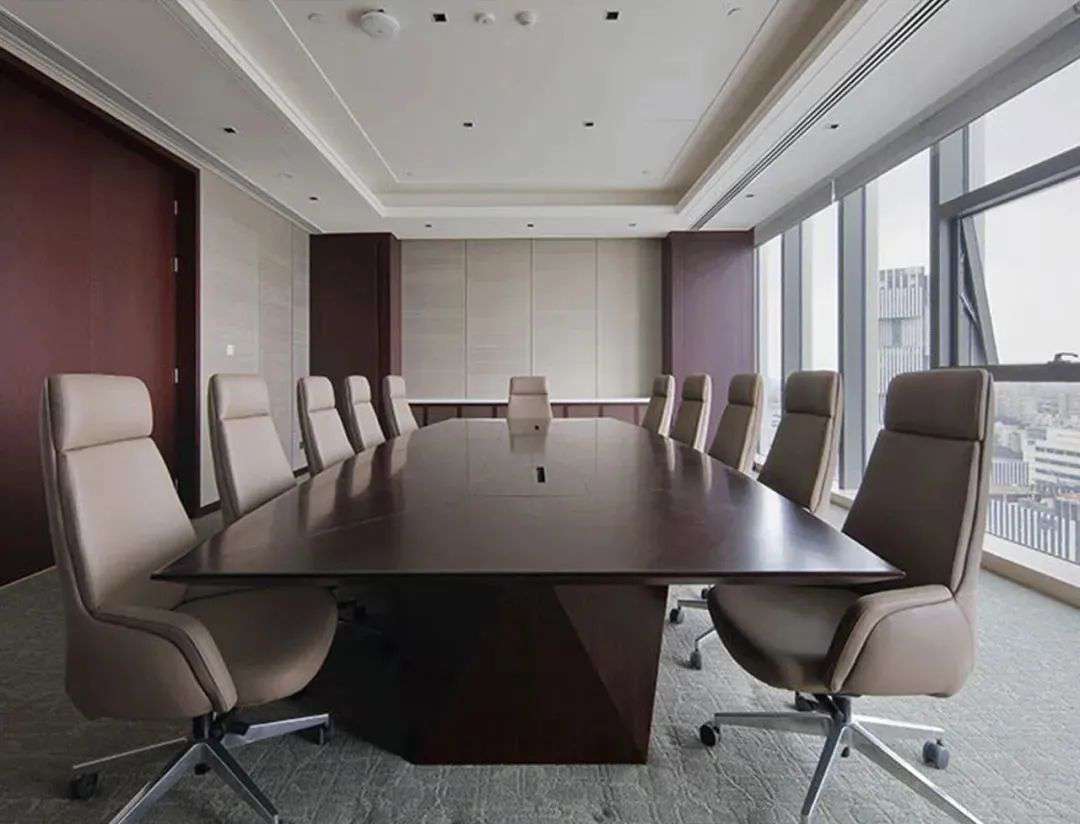 米白墻面、胡桃紅木、淺棕灰皮質(zhì)相結(jié)合能營(yíng)造出不一樣的三維色彩層次,嵌入式線條燈勾勒出空間層次,配合有節(jié)奏的射燈排布,滿足會(huì)議基本照明需求的同時(shí)營(yíng)造明凈與通透的質(zhì)感。