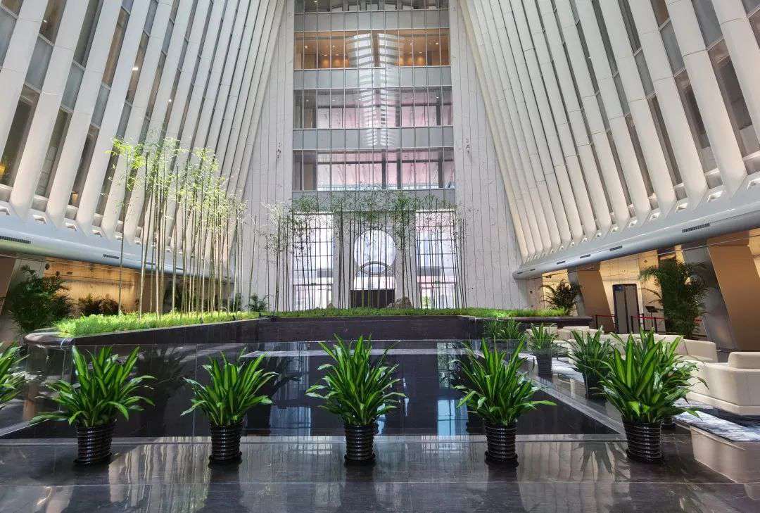 走進(jìn)敞亮天幕下的大廈中庭,引向天幕的巨型線條莊嚴(yán)穩(wěn)固,天幕自然采光,節(jié)能環(huán)保。