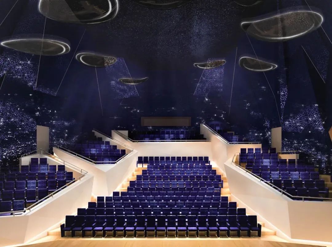 走進(jìn)內(nèi)部,一個(gè)偌大的音樂(lè)廳展現(xiàn)在眼前,蔚藍(lán)色的天花板上燈光閃爍,在燈光的照射下形成夜晚星空一般的夢(mèng)幻效果.