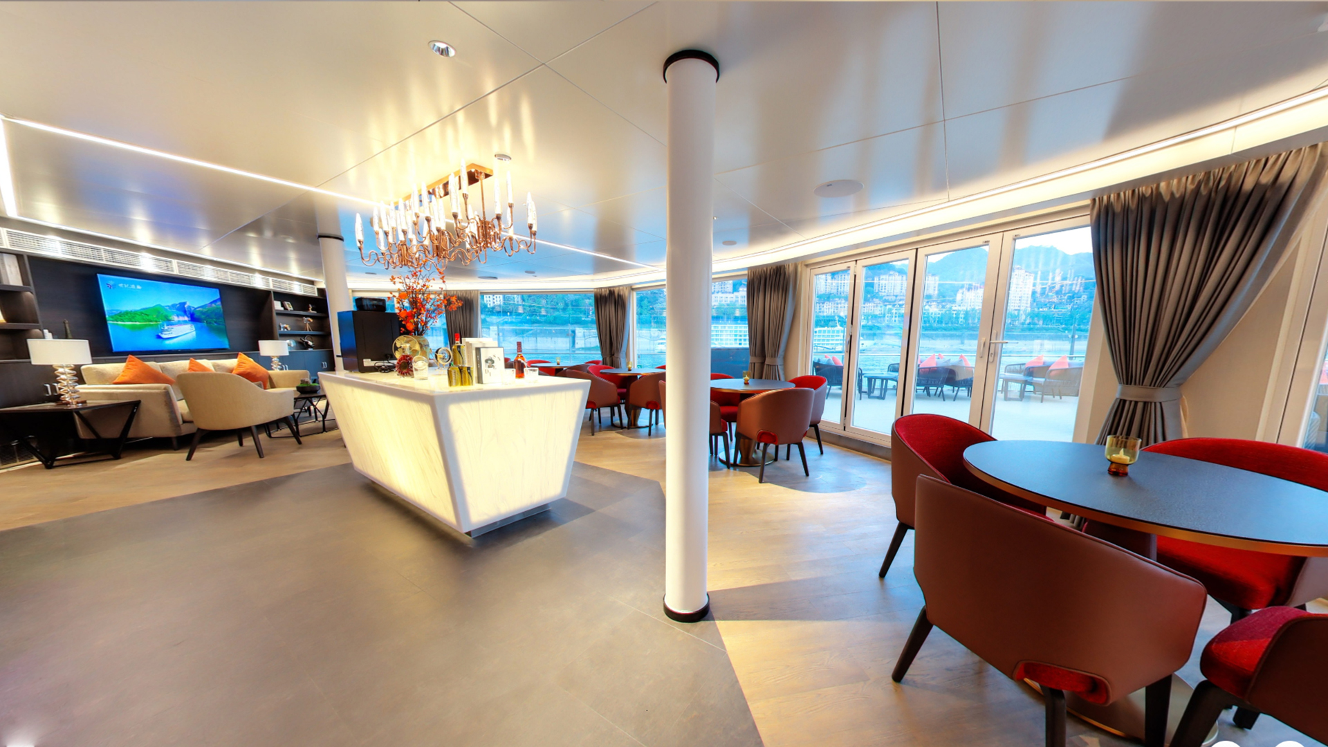 江面粼粼的波光配合著室內(nèi)柔和的燈光