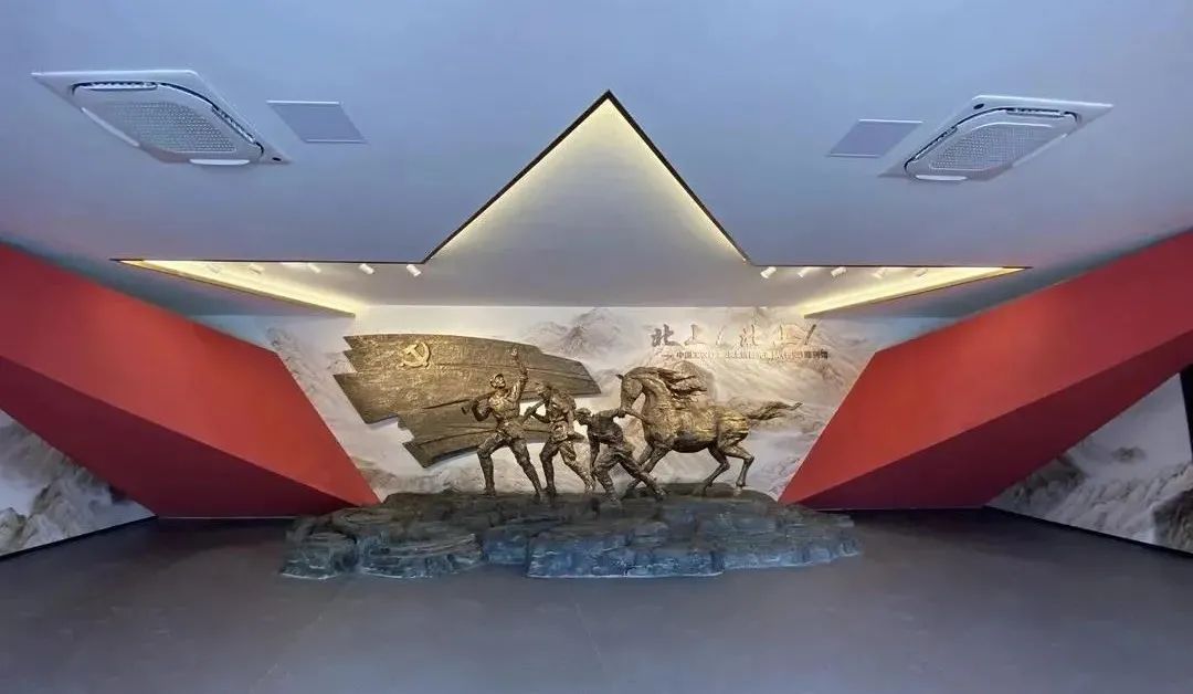 步入序廳,映入眼簾的“北上!北上!”主題雕塑,塑造了不屈不撓、英勇無畏的英雄戰(zhàn)士形象,選用Geosheen極成防眩軌道燈對雕像做重點(diǎn)照明,明暗對比,燈帶做輔助,起到了很好的裝飾效果,點(diǎn)亮紅軍的整體精神氣魄。