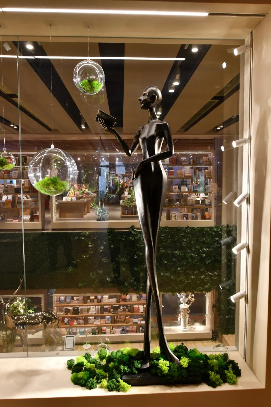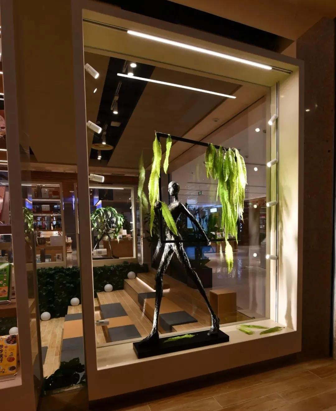 櫥窗里的藝術(shù)裝置是畢業(yè)于英國(guó)DMU大學(xué)建筑設(shè)計(jì)學(xué)院的張宇軒設(shè)計(jì),名為“共生”,它所表達(dá)的中心思想是人與自然和諧共處,貼合讀書閣藝術(shù)文化、綠色自然的主題。展柜邊緣放置的Geosheen極成燈帶和軌道燈營(yíng)造重點(diǎn)且無(wú)眩光的照明環(huán)境,給人以與眾不同的美學(xué)體驗(yàn)時(shí),還可在視覺(jué)上突出展品。