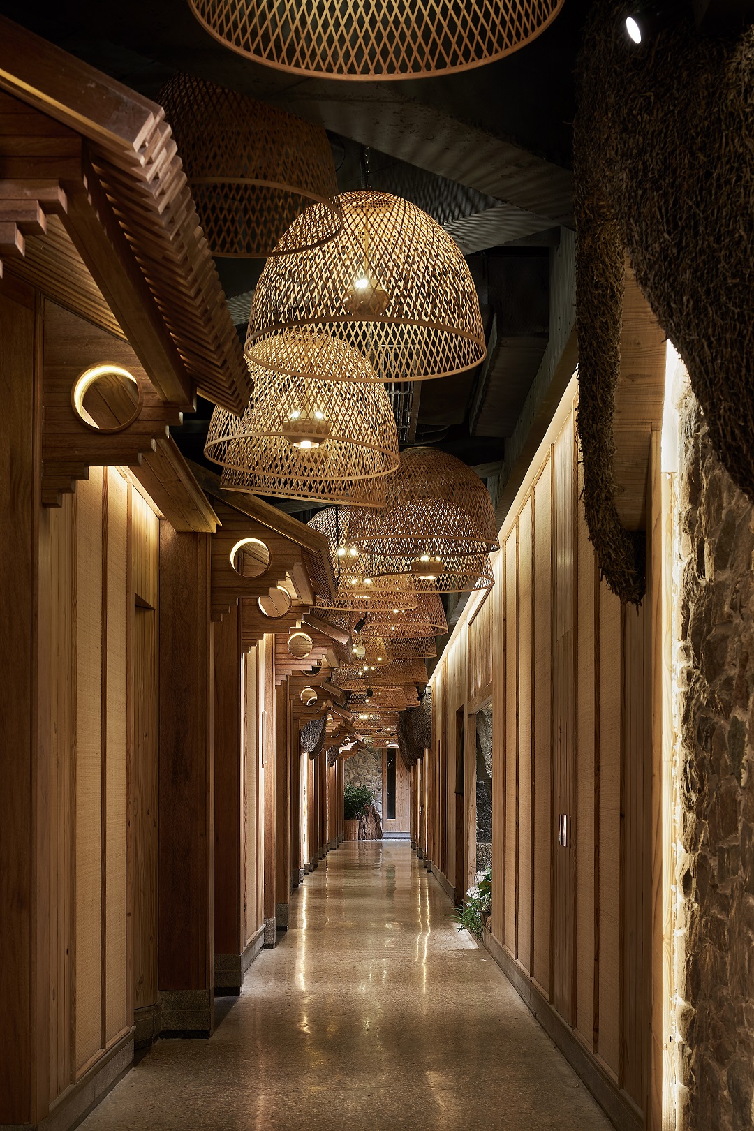 整體空間燈光以色溫3000K為主,點(diǎn)線照明相結(jié)合,亮點(diǎn)規(guī)律性排列與變化可以產(chǎn)生節(jié)奏感和韻律感,線光引導(dǎo)視線和明確方位,光的形態(tài),使環(huán)境倍增親切感人的魅力。中角度與小角度結(jié)合,使空間更有層次感。明暗對比度適中,燈光氛圍烘托下產(chǎn)生質(zhì)樸而且有地方特色的韻味。