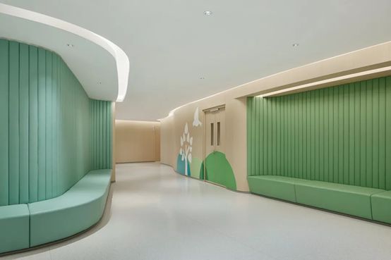 北京京都兒童醫(yī)院的候診區(qū)墻面設(shè)計使用了大面積的綠色色調(diào):綠色代表安全、平靜、舒適之感,是大自然的顏色。在綠色環(huán)境中,能夠有效安撫兒童的不安情緒,消除他們對醫(yī)院的排斥感和恐懼感。