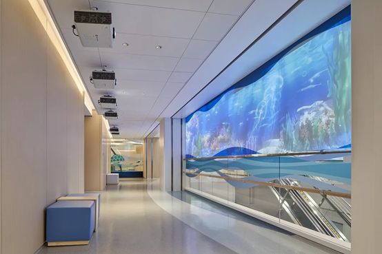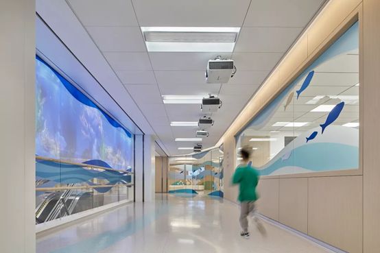 為了避免走廊設(shè)計過于單調(diào),北京京都兒童醫(yī)院使用了鎮(zhèn)靜色系——藍色系,適當使用藍綠色調(diào)的墻面圖案,讓小孩的緊張情緒得以放松。