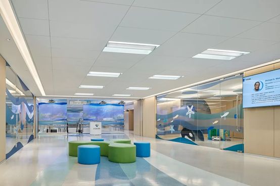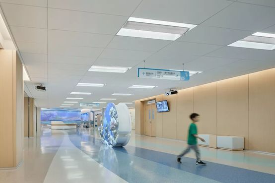 公共大廳是人員流動最為頻繁的中樞地帶之一,與診室、走廊、樓梯等相接。北京京都兒童醫(yī)院在公共區(qū)域在天花上采用了 LED 平板燈,通過導光板將燈光均勻分散于發(fā)光面,具有亮度高、照明均勻、光線柔和和無交流頻閃等特點。