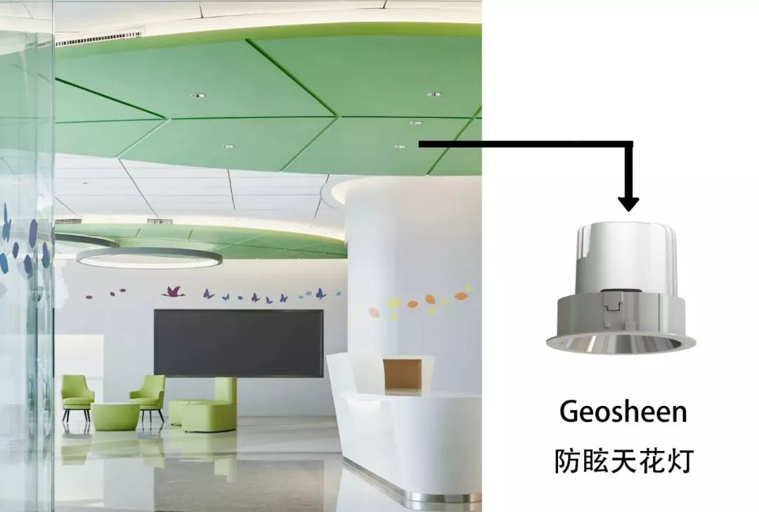 此處頂部心形狀的綠葉上就裝嵌了多盞4000K的Geosheen防眩天花燈,可調(diào)的照射角度也讓醫(yī)院在具體使用時更加便捷。
