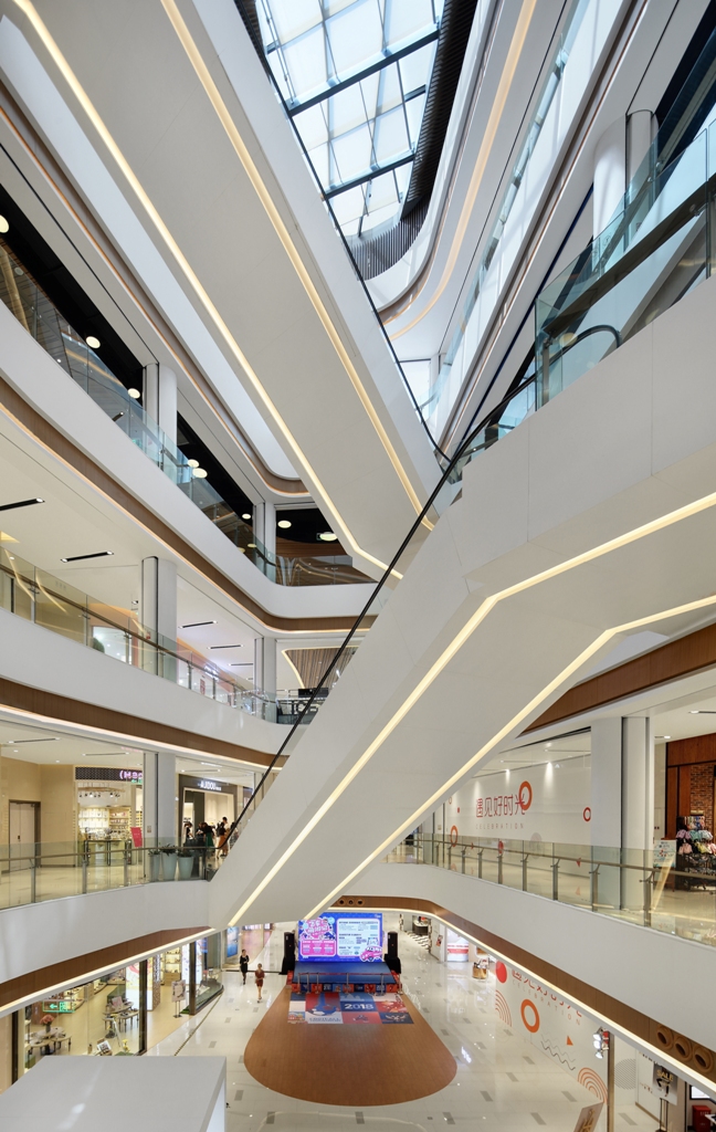 線條燈帶裝飾電扶梯的結(jié)構(gòu),暖色光裝飾純白的建筑結(jié)構(gòu),極簡又清透。