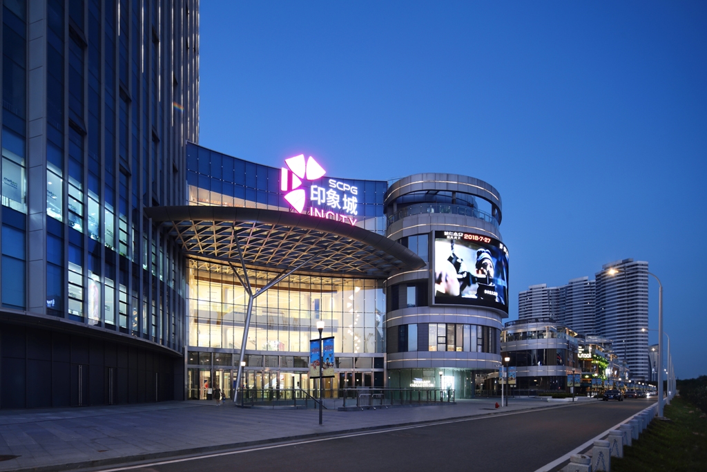 印象城的發(fā)光LOGO標(biāo)志與商場玻璃幕墻內(nèi)透光是視覺主體。柔和的光線傳遞一個(gè)信息: