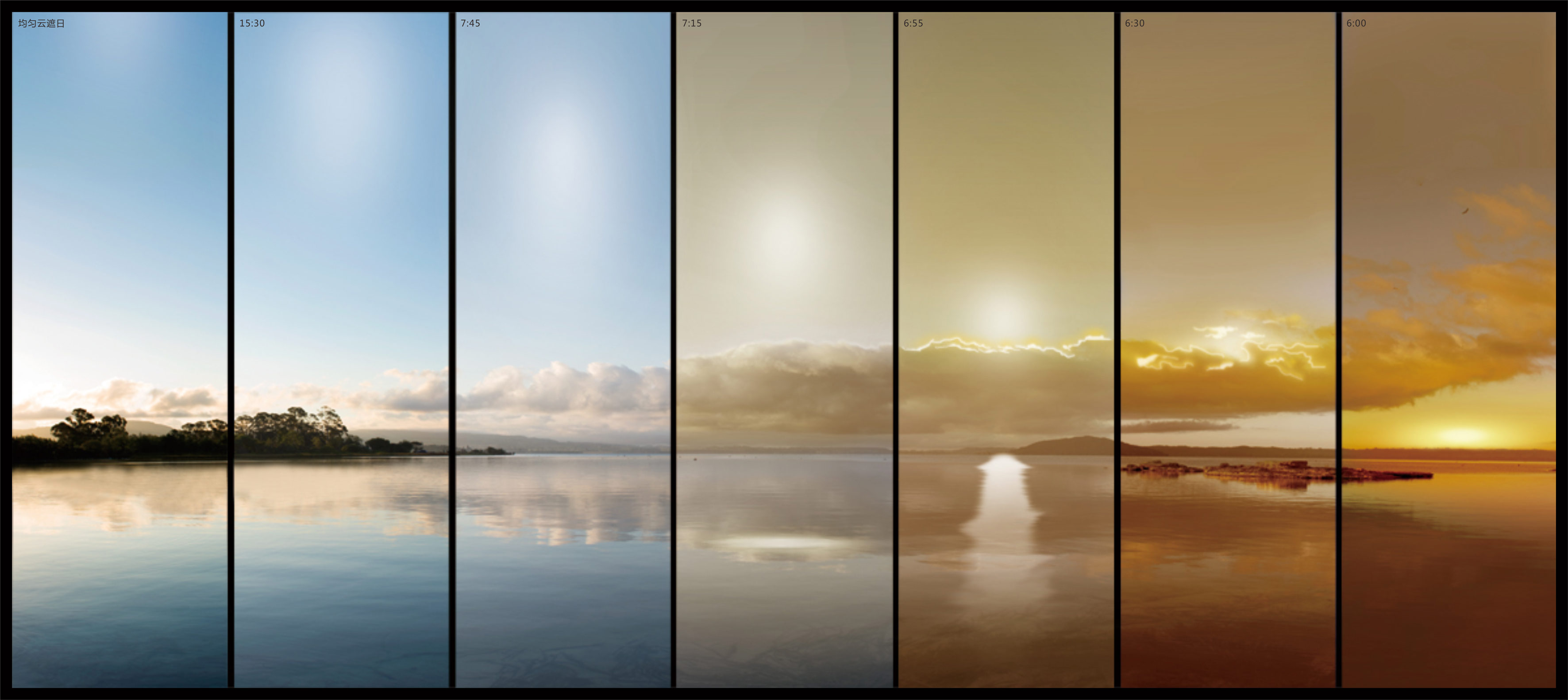 一天的日光色溫變化,從左至右分別是均勻云遮日、15:30、7:45、7:15、6:55、6:30、6:00。(圖片來源:Geosheen極成案例)