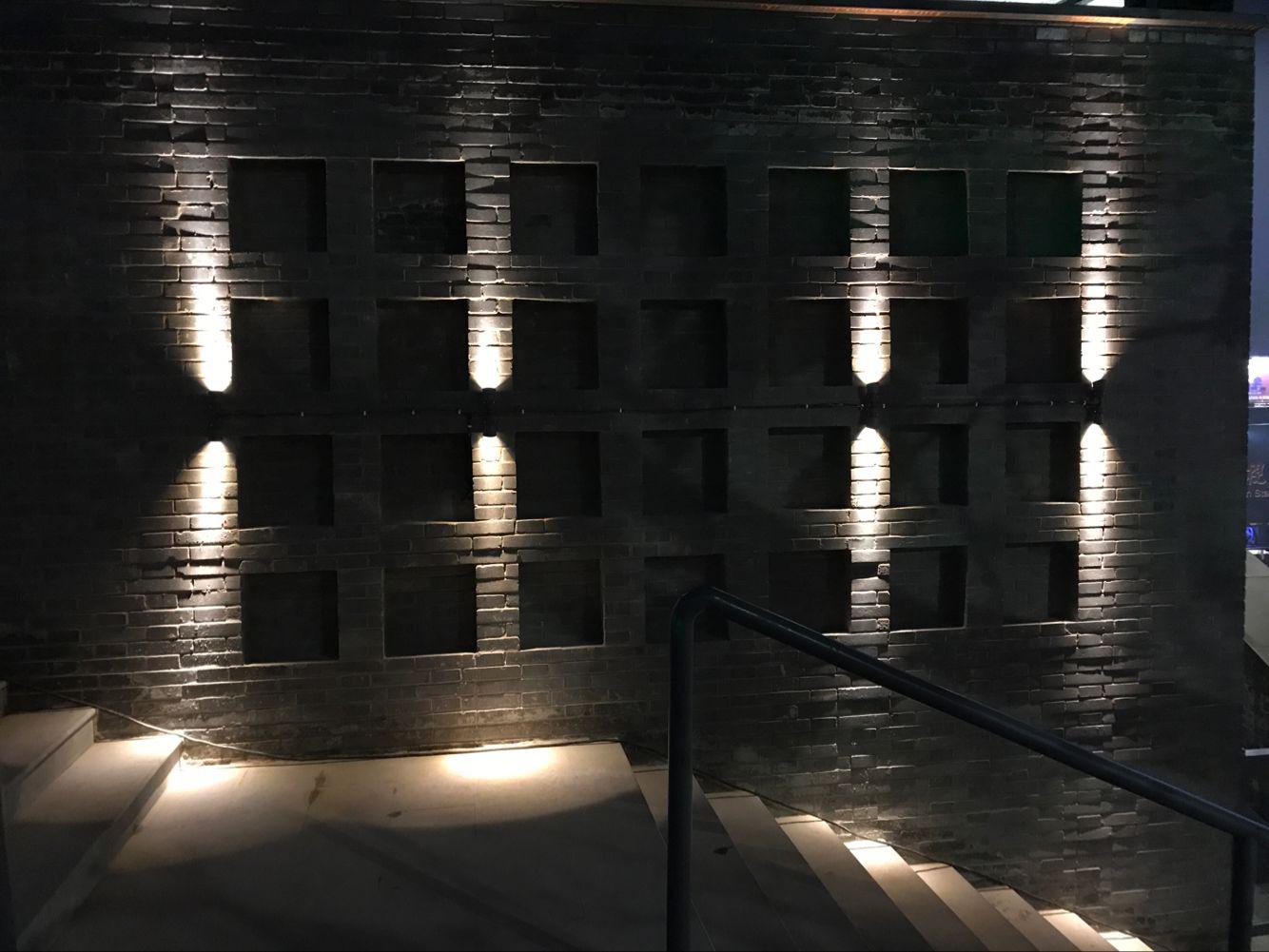 露天劇場采用兩頭壁燈,燈光上下照射不晃眼睛,聚焦樓梯口位置,建立起過道的空間指向——即是安全引導(dǎo),也用燈光點(diǎn)綴了整個(gè)露天劇場,有序的間隔光描摹出疏朗靜謐的古建筑氛圍。