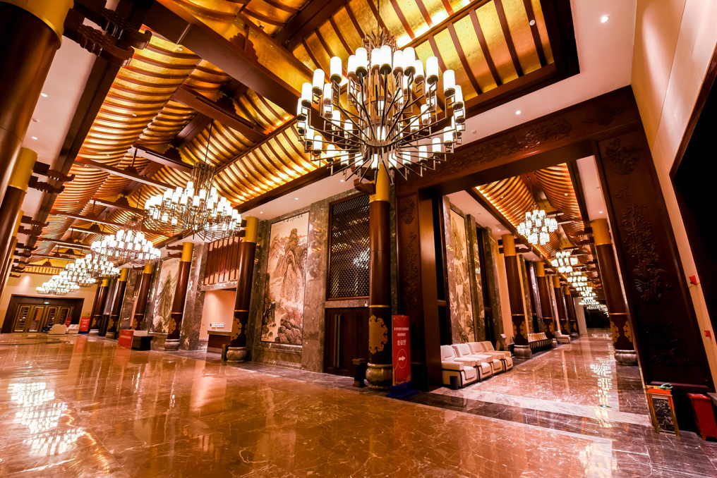 ▲宴會前廳,如果說去宴會廳是一場感受中華美食的味蕾盛宴,那么走在宴會前廳一定是一場感受中華文化的視覺盛宴。用燈帶的暖黃色光洗亮檐廊,天花四周及檐廊兩組不同組合的燈具分別用來給予走廊兩側(cè)壁畫重點照明及環(huán)境照明,空間層次豐富,使走在其中的你盡情感受中華文化的魅力。