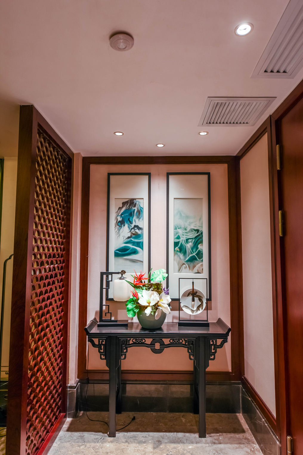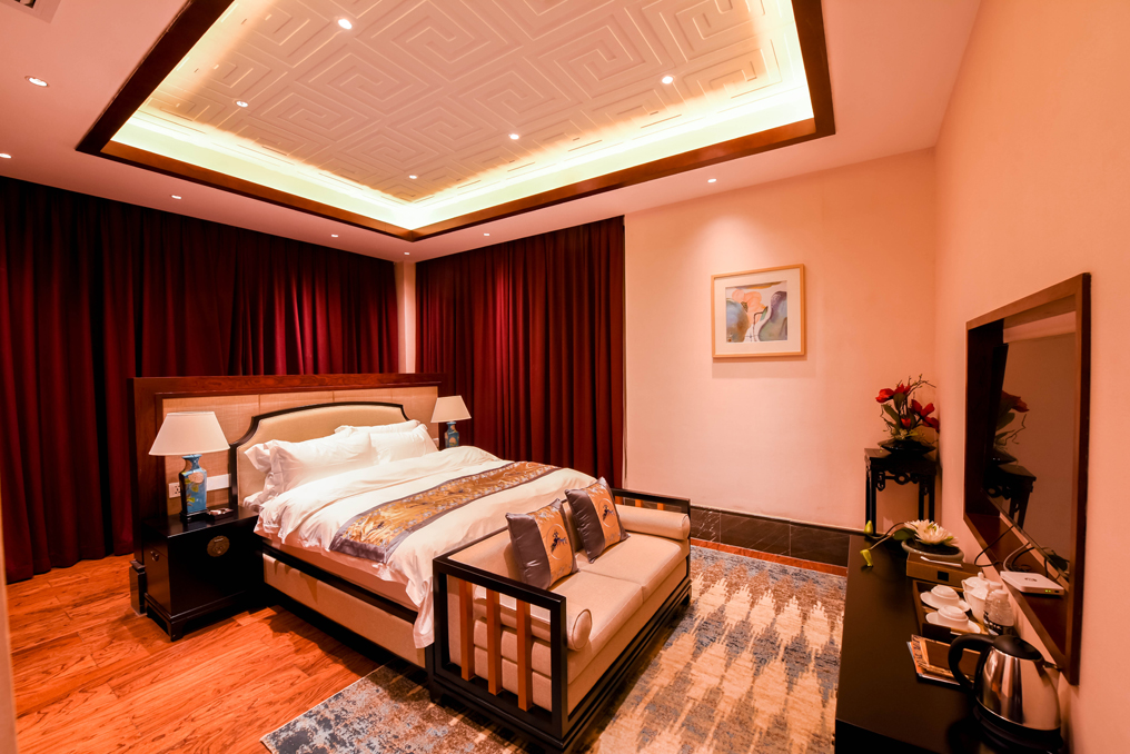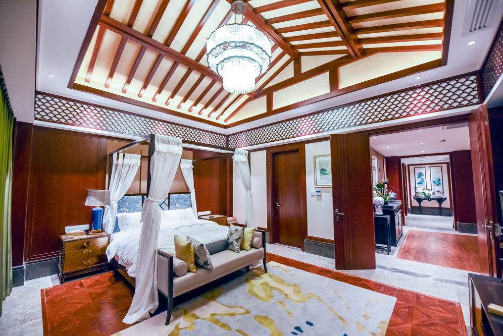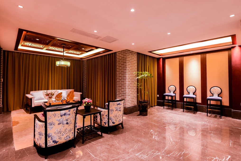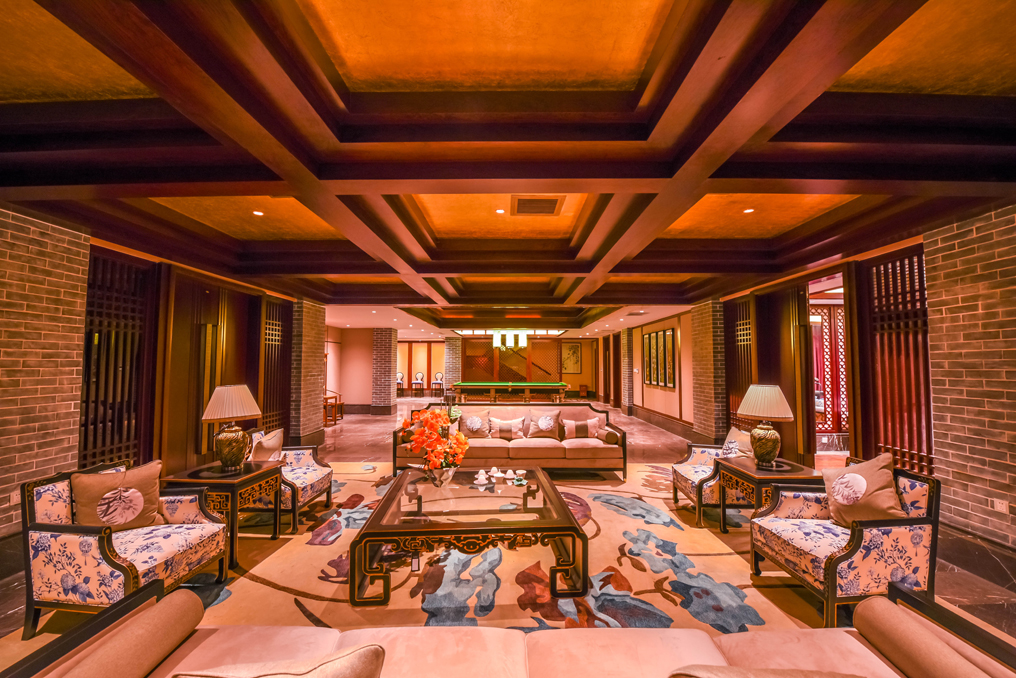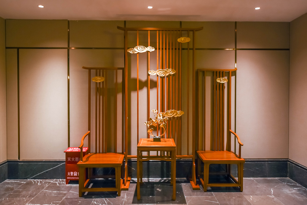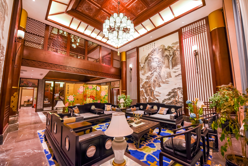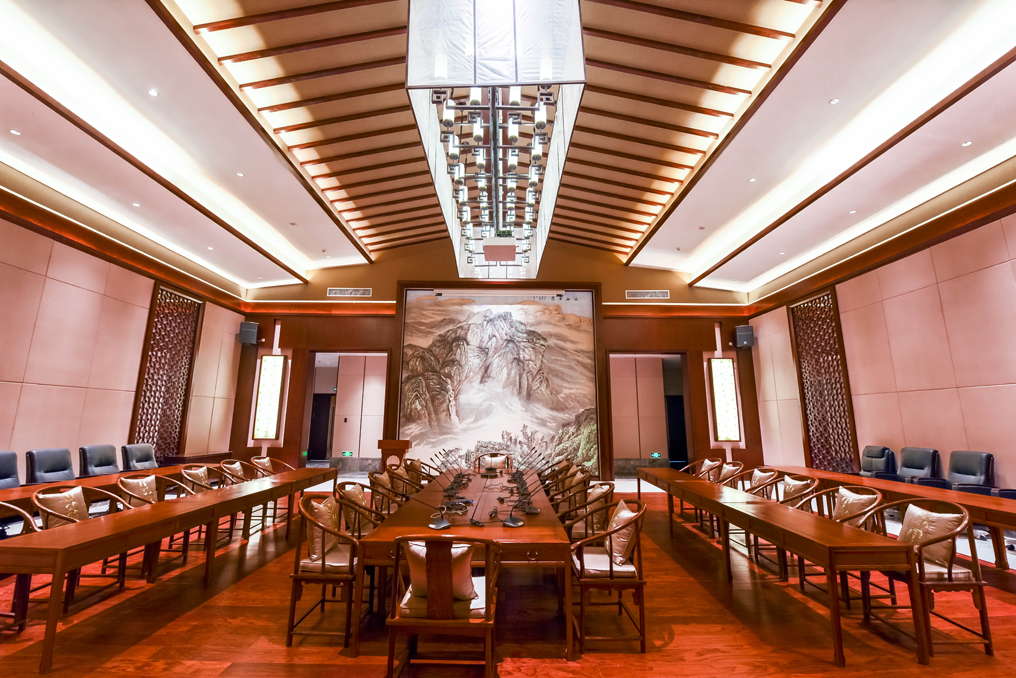 ▲將象征中華文化的水墨畫、實木花格圖案等裝飾融入室內(nèi)設(shè)計中,簡潔明快的燈光同時引入自然光,使得敞開的空間不會感到空曠、冷感,營造出現(xiàn)代而又不失中華文化的高大空間。