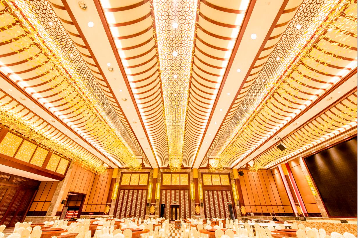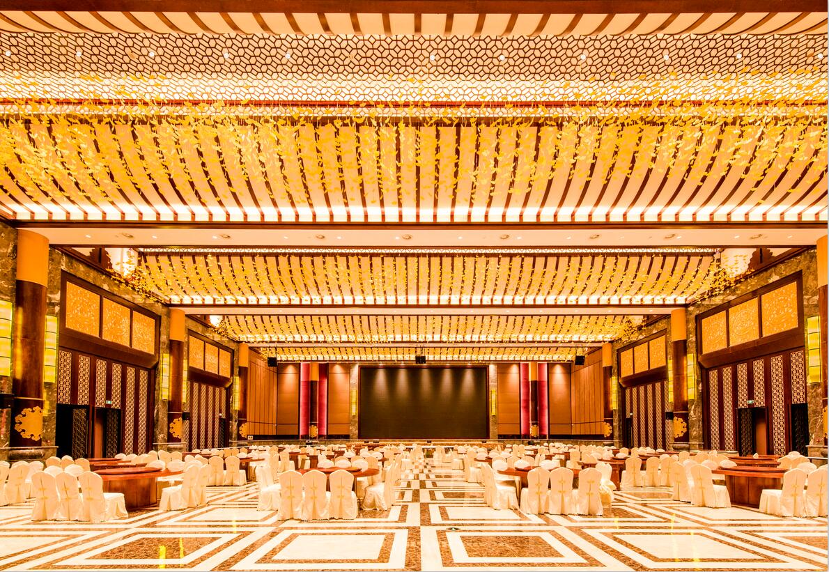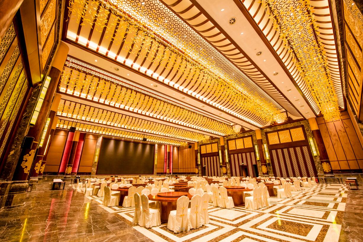 ▲宴會廳可容納600人,空間無柱式的設(shè)計使其更顯寬敞開闊。宴會廳支持主持、宴會,舞會三種模式,天花層高11-14m,不同組合的燈具有序的排列均勻照亮空間為不同場景提供有效燈光環(huán)境。天花上星星點點的裝飾,巧妙的用暖黃光點綴,一場味蕾的盛宴充滿溫馨,同時對宴會廳的主席臺、舞臺給予重點照亮,整體氣勢恢宏又不乏東方韻。