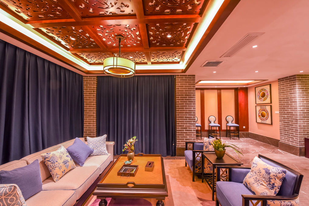 ▲休閑娛樂空間,古樸的棕紅色吊頂帶出空間無限雅致,燈光柔和舒適,為疲憊一天的與會朋友帶來一絲精神上的休息。