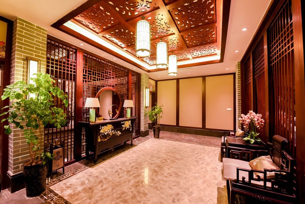 ▲通過屏風、鏤空紋閣等室內(nèi)裝飾元素來實現(xiàn)移步換景的中式裝修手法,通過燈光對有中華特色的祥云,字畫等元素進行重點照明,以使從不同角度進行觀賞,都能達到預(yù)期的觀賞效果,煥發(fā)濃濃的中國味道。
