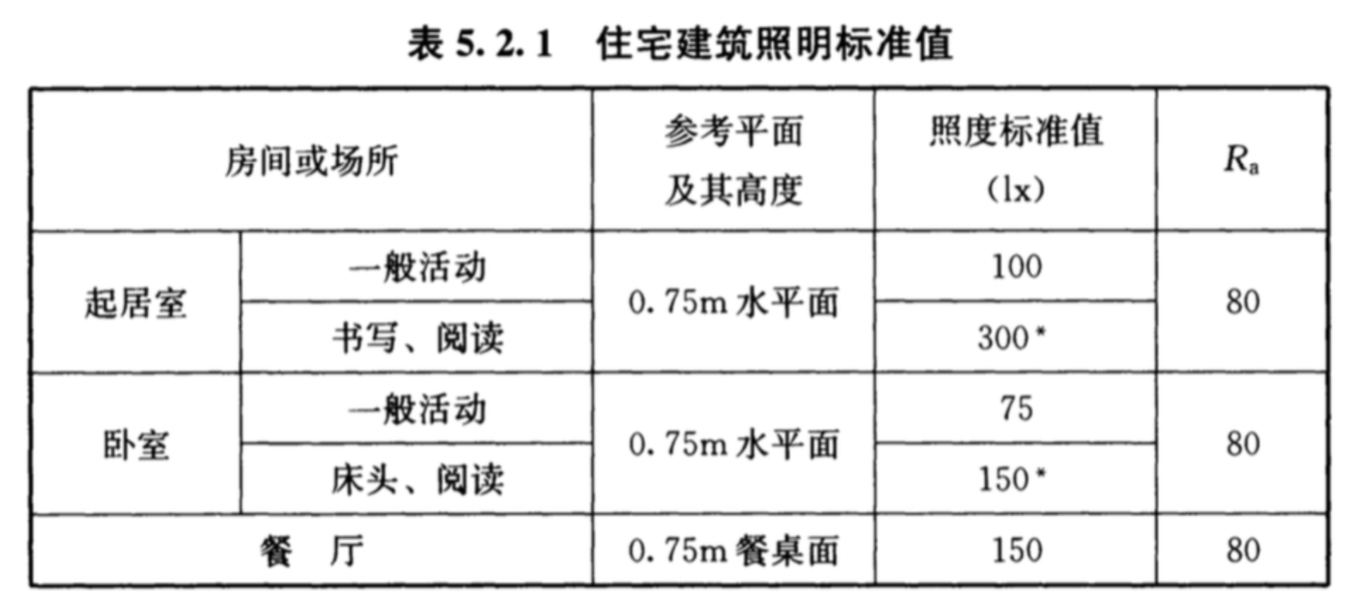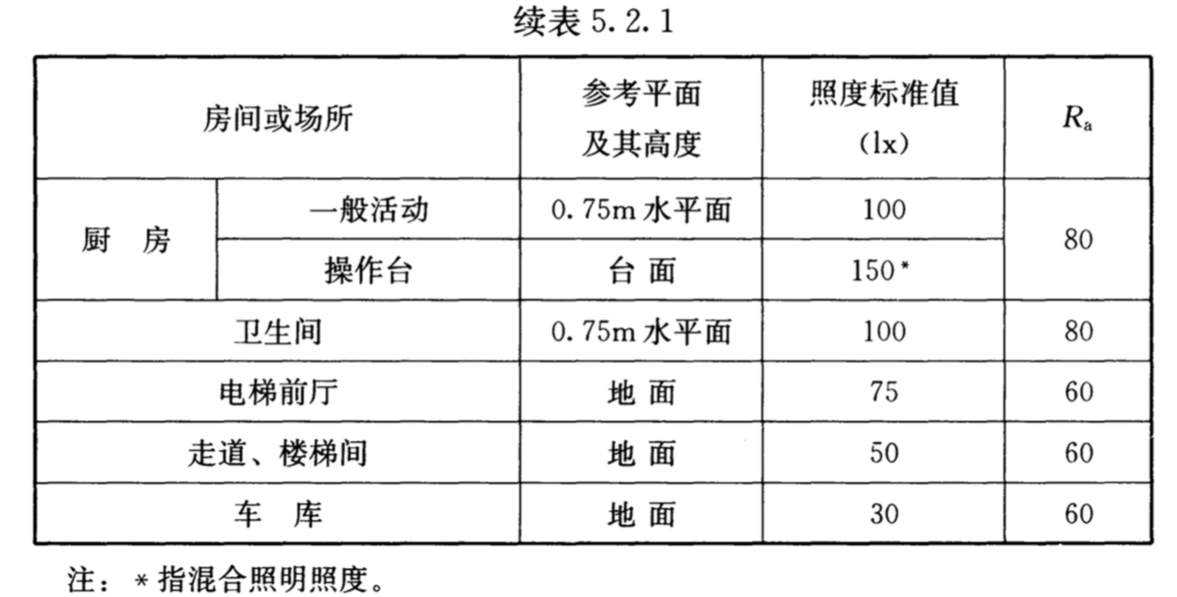 照度標準如下表: