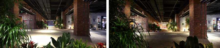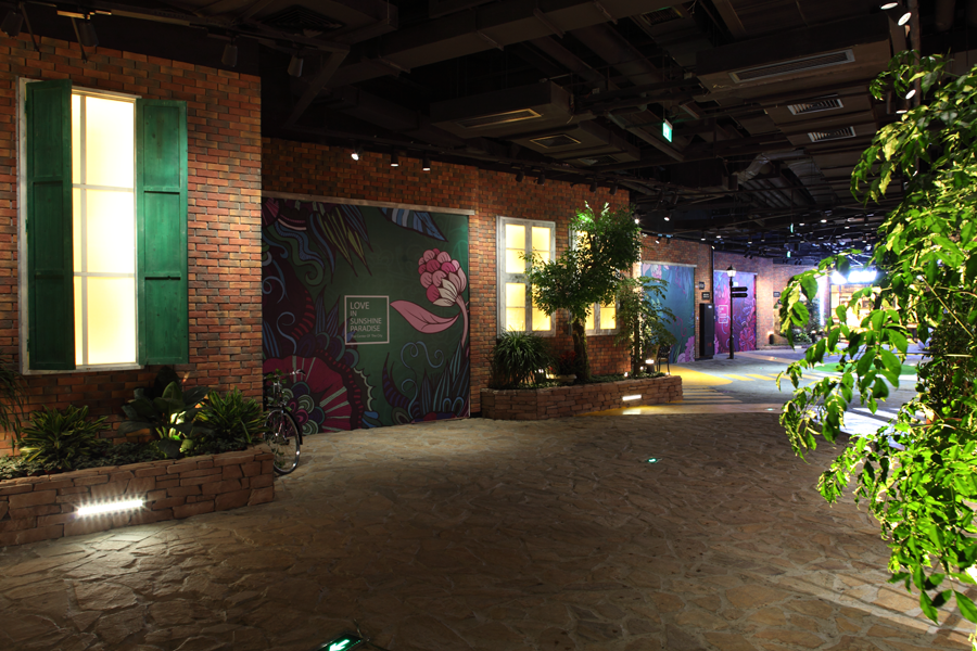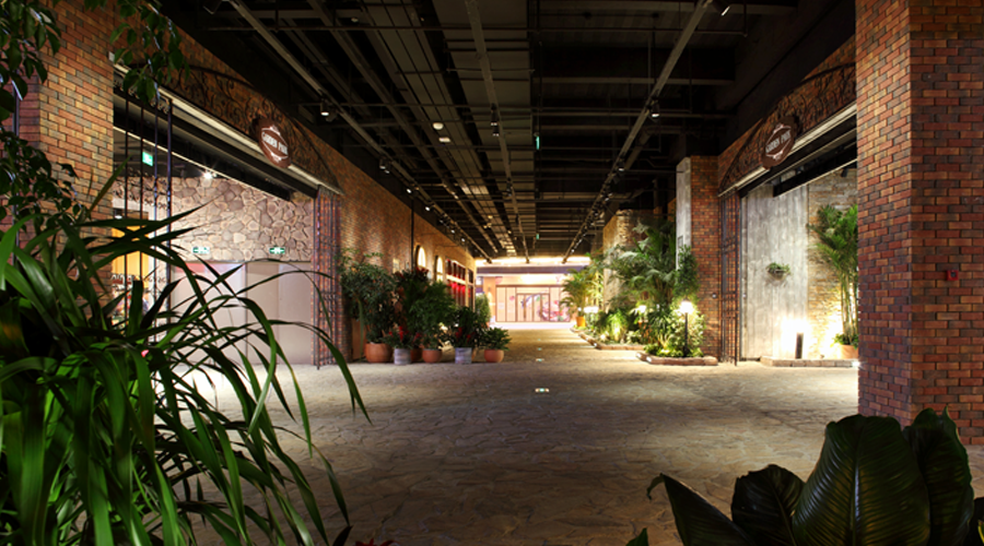 小鎮(zhèn)內(nèi)景的材料運(yùn)用復(fù)雜,顏色以綠色為主,混入了各種鮮艷的色彩,立體綠植墻,各種尺度的花盆盆栽,花壇,室內(nèi)水景,噴水池等。面對多元素空間,逆向而行,思考一種“簡單”的處理方式。通過安裝節(jié)點(diǎn)的處理/調(diào)光控制也可呈現(xiàn)出滿意的設(shè)計(jì)效果。運(yùn)用軌道燈具產(chǎn)品照明,看似復(fù)雜,其實(shí)為一種元素的不斷變化產(chǎn)生不同的場景。