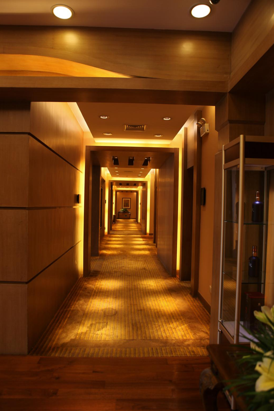 圖:過道兩旁的燈光有序的照射在地上,配合墻上的立面照明,起到一個引導(dǎo)的作用。低色溫的間接照明會渲染出一種走在“黃金大道”上的感覺(圖片來源極成光電照明案例)