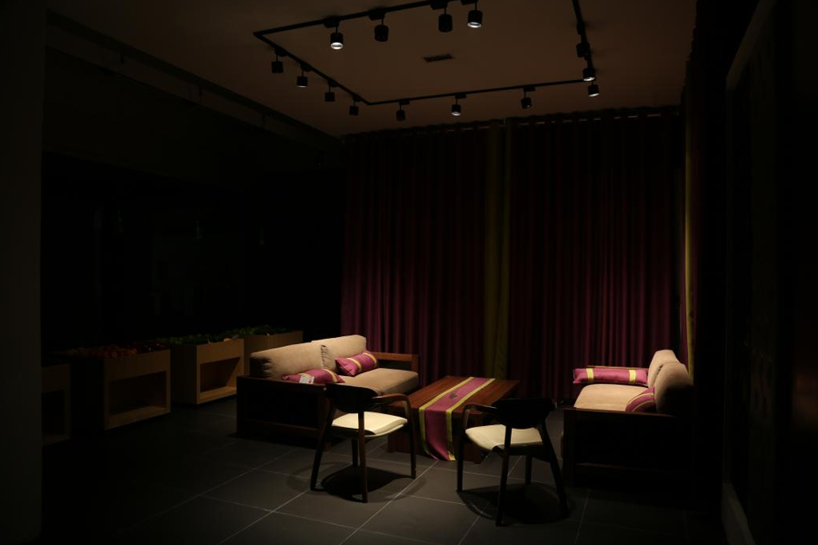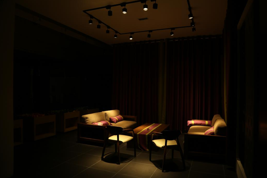 圖:當(dāng)需要進行交流時(如跟客戶談生意這種稍微正式一些的場景),可以控制燈光只照射在座位上,可以看清雙方的面部(圖片來源極成光電展廳)