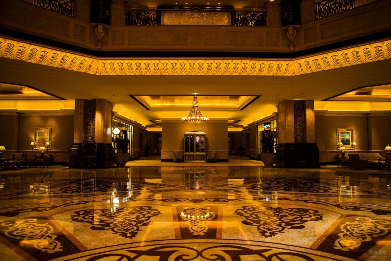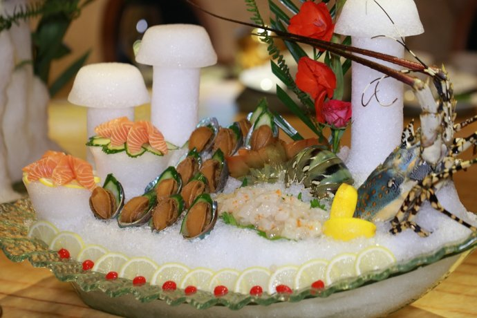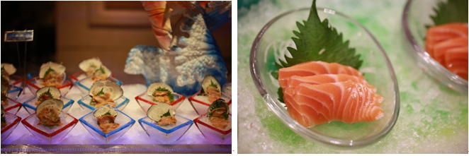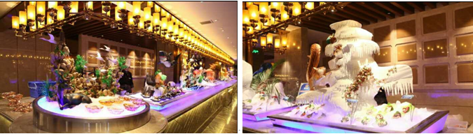 解析:密集的黃銅材質(zhì)燭臺(tái)燈不僅體現(xiàn)了奢華的基調(diào)和復(fù)古的宮廷風(fēng),而且不動(dòng)聲色的提升了取餐臺(tái)整體空間的照度,點(diǎn)綴其中的是,下面冰雕的藍(lán)色反射光,讓冰凍的海鮮菜品得到了完美的表現(xiàn)。