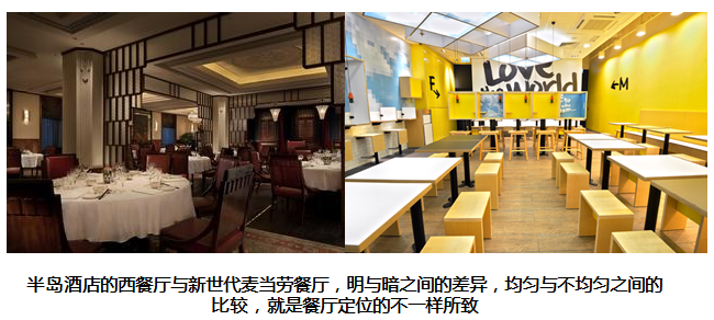 定位錯(cuò)了,后面做的一切都是白搭,比如說(shuō):一個(gè)中高端餐廳和一個(gè)快餐店的定位不一樣,中高端的注重用餐體驗(yàn),而快餐店是快消型的,注重快速流動(dòng),實(shí)現(xiàn)比較高的翻臺(tái)率。這兩種不同的定位其燈光設(shè)計(jì)或者照明設(shè)計(jì)肯定是不一樣的。